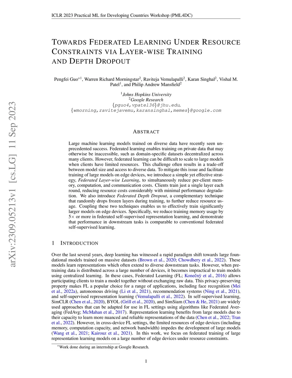 Large machine learning models trained on diverse data have recently seen unprecedented success. Federated learning enables training on private data that may otherwise be inaccessible, such as domain-specific datasets decentralized across many clients. However, federated learning can be difficult to scale to large models when clients have limited resources. This challenge often results in a trade-off between model size and access to diverse data. To mitigate this issue and facilitate training of large models on edge devices, we introduce a simple yet effective strategy, Federated Layer-wise Learning, to simultaneously reduce per-client memory, computation, and communication costs. Clients train just a single layer each round, reducing resource costs considerably with minimal performance degradation. We also introduce Federated Depth Dropout, a complementary technique that randomly drops frozen layers during training, to further reduce resource usage. Coupling these two techniques enables us to effectively train significantly larger models on edge devices. Specifically, we reduce training memory usage by 5x or more in federated self-supervised representation learning and demonstrate that performance in downstream tasks is comparable to conventional federated self-supervised learning.