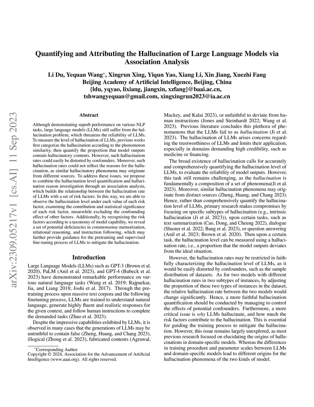 Although demonstrating superb performance on various NLP tasks, large language models (LLMs) still suffer from the hallucination problem, which threatens the reliability of LLMs. To measure the level of hallucination of LLMs, previous works first categorize the hallucination according to the phenomenon similarity, then quantify the proportion that model outputs contain hallucinatory contents. However, such hallucination rates could easily be distorted by confounders. Moreover, such hallucination rates could not reflect the reasons for the hallucination, as similar hallucinatory phenomena may originate from different sources. To address these issues, we propose to combine the hallucination level quantification and hallucination reason investigation through an association analysis, which builds the relationship between the hallucination rate of LLMs with a set of risk factors. In this way, we are able to observe the hallucination level under each value of each risk factor, examining the contribution and statistical significance of each risk factor, meanwhile excluding the confounding effect of other factors. Additionally, by recognizing the risk factors according to a taxonomy of model capability, we reveal a set of potential deficiencies in commonsense memorization, relational reasoning, and instruction following, which may further provide guidance for the pretraining and supervised fine-tuning process of LLMs to mitigate the hallucination.