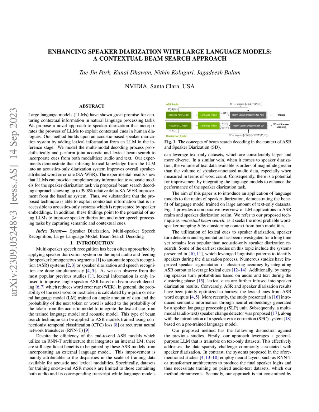 Large language models (LLMs) have shown great promise for capturing contextual information in natural language processing tasks. We propose a novel approach to speaker diarization that incorporates the prowess of LLMs to exploit contextual cues in human dialogues. Our method builds upon an acoustic-based speaker diarization system by adding lexical information from an LLM in the inference stage. We model the multi-modal decoding process probabilistically and perform joint acoustic and lexical beam search to incorporate cues from both modalities: audio and text. Our experiments demonstrate that infusing lexical knowledge from the LLM into an acoustics-only diarization system improves overall speaker-attributed word error rate (SA-WER). The experimental results show that LLMs can provide complementary information to acoustic models for the speaker diarization task via proposed beam search decoding approach showing up to 39.8% relative delta-SA-WER improvement from the baseline system. Thus, we substantiate that the proposed technique is able to exploit contextual information that is inaccessible to acoustics-only systems which is represented by speaker embeddings. In addition, these findings point to the potential of using LLMs to improve speaker diarization and other speech processing tasks by capturing semantic and contextual cues.