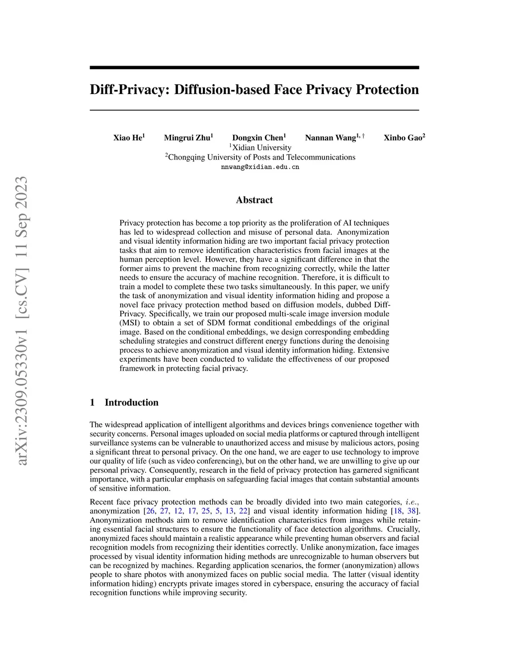 Privacy protection has become a top priority as the proliferation of AI techniques has led to widespread collection and misuse of personal data. Anonymization and visual identity information hiding are two important facial privacy protection tasks that aim to remove identification characteristics from facial images at the human perception level. However, they have a significant difference in that the former aims to prevent the machine from recognizing correctly, while the latter needs to ensure the accuracy of machine recognition. Therefore, it is difficult to train a model to complete these two tasks simultaneously. In this paper, we unify the task of anonymization and visual identity information hiding and propose a novel face privacy protection method based on diffusion models, dubbed Diff-Privacy. Specifically, we train our proposed multi-scale image inversion module (MSI) to obtain a set of SDM format conditional embeddings of the original image. Based on the conditional embeddings, we design corresponding embedding scheduling strategies and construct different energy functions during the denoising process to achieve anonymization and visual identity information hiding. Extensive experiments have been conducted to validate the effectiveness of our proposed framework in protecting facial privacy.