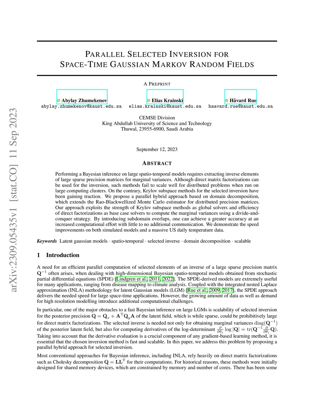 Performing a Bayesian inference on large spatio-temporal models requires extracting inverse elements of large sparse precision matrices for marginal variances. Although direct matrix factorizations can be used for the inversion, such methods fail to scale well for distributed problems when run on large computing clusters. On the contrary, Krylov subspace methods for the selected inversion have been gaining traction. We propose a parallel hybrid approach based on domain decomposition, which extends the Rao-Blackwellized Monte Carlo estimator for distributed precision matrices. Our approach exploits the strength of Krylov subspace methods as global solvers and efficiency of direct factorizations as base case solvers to compute the marginal variances using a divide-and-conquer strategy. By introducing subdomain overlaps, one can achieve a greater accuracy at an increased computational effort with little to no additional communication. We demonstrate the speed improvements on both simulated models and a massive US daily temperature data.