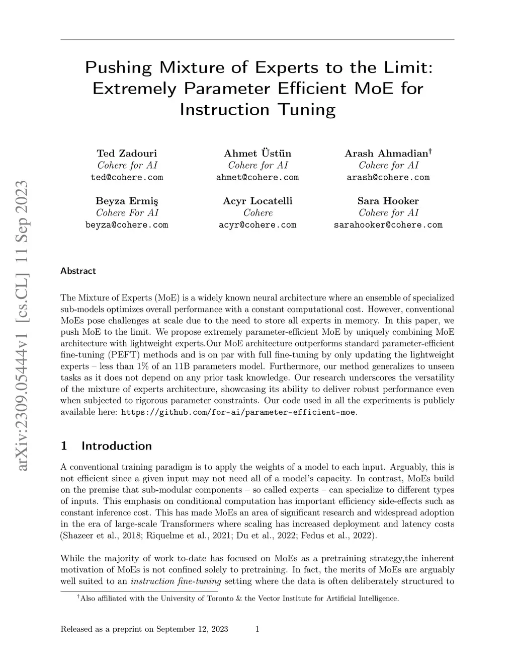 The Mixture of Experts (MoE) is a widely known neural architecture where an ensemble of specialized sub-models optimizes overall performance with a constant computational cost. However, conventional MoEs pose challenges at scale due to the need to store all experts in memory. In this paper, we push MoE to the limit. We propose extremely parameter-efficient MoE by uniquely combining MoE architecture with lightweight experts.Our MoE architecture outperforms standard parameter-efficient fine-tuning (PEFT) methods and is on par with full fine-tuning by only updating the lightweight experts -- less than 1% of an 11B parameters model. Furthermore, our method generalizes to unseen tasks as it does not depend on any prior task knowledge. Our research underscores the versatility of the mixture of experts architecture, showcasing its ability to deliver robust performance even when subjected to rigorous parameter constraints. Our code used in all the experiments is publicly available here: https://github.com/for-ai/parameter-efficient-moe.