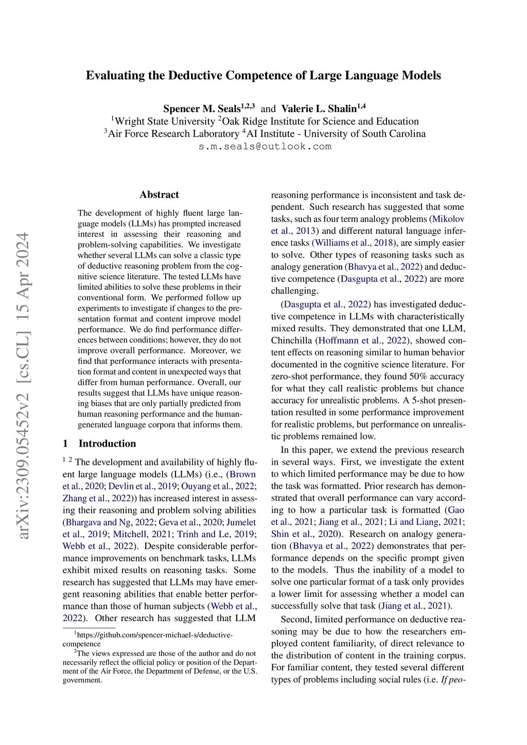 The development of highly fluent large language models (LLMs) has prompted increased interest in assessing their reasoning and problem-solving capabilities. We investigate whether several LLMs can solve a classic type of deductive reasoning problem from the cognitive science literature. The tested LLMs have limited abilities to solve these problems in their conventional form. We performed follow up experiments to investigate if changes to the presentation format and content improve model performance. We do find performance differences between conditions; however, they do not improve overall performance. Moreover, we find that performance interacts with presentation format and content in unexpected ways that differ from human performance. Overall, our results suggest that LLMs have unique reasoning biases that are only partially predicted from human reasoning performance and the human-generated language corpora that informs them.