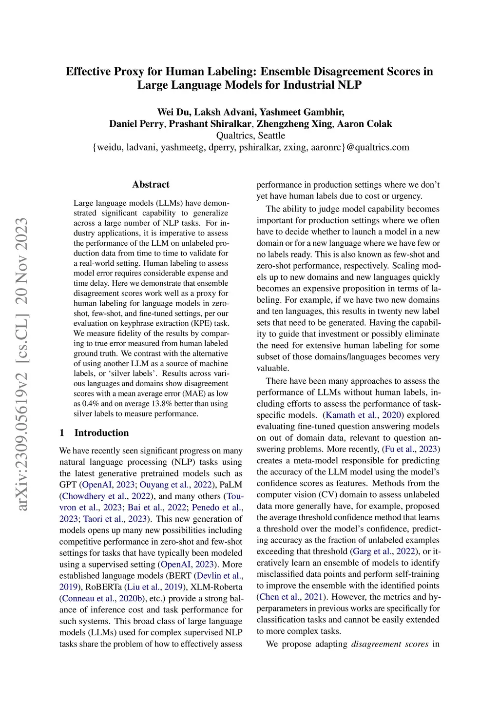 Large language models (LLMs) have demonstrated significant capability to generalize across a large number of NLP tasks. For industry applications, it is imperative to assess the performance of the LLM on unlabeled production data from time to time to validate for a real-world setting. Human labeling to assess model error requires considerable expense and time delay. Here we demonstrate that ensemble disagreement scores work well as a proxy for human labeling for language models in zero-shot, few-shot, and fine-tuned settings, per our evaluation on keyphrase extraction (KPE) task. We measure fidelity of the results by comparing to true error measured from human labeled ground truth. We contrast with the alternative of using another LLM as a source of machine labels, or silver labels. Results across various languages and domains show disagreement scores provide a better estimation of model performance with mean average error (MAE) as low as 0.4% and on average 13.8% better than using silver labels.