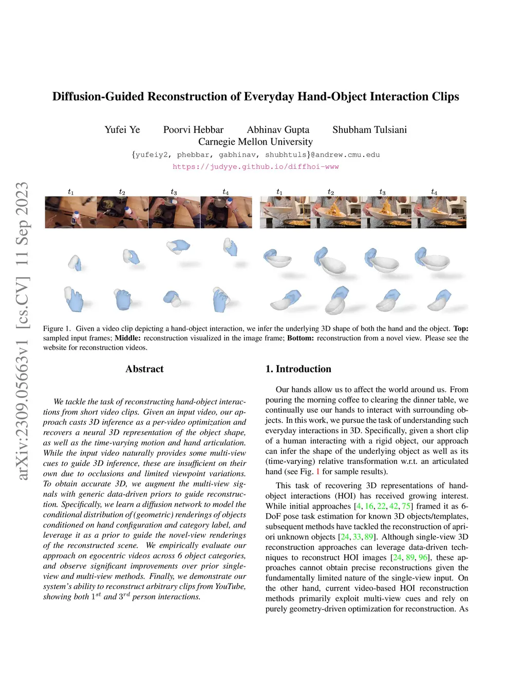 We tackle the task of reconstructing hand-object interactions from short video clips. Given an input video, our approach casts 3D inference as a per-video optimization and recovers a neural 3D representation of the object shape, as well as the time-varying motion and hand articulation. While the input video naturally provides some multi-view cues to guide 3D inference, these are insufficient on their own due to occlusions and limited viewpoint variations. To obtain accurate 3D, we augment the multi-view signals with generic data-driven priors to guide reconstruction. Specifically, we learn a diffusion network to model the conditional distribution of (geometric) renderings of objects conditioned on hand configuration and category label, and leverage it as a prior to guide the novel-view renderings of the reconstructed scene. We empirically evaluate our approach on egocentric videos across 6 object categories, and observe significant improvements over prior single-view and multi-view methods. Finally, we demonstrate our system's ability to reconstruct arbitrary clips from YouTube, showing both 1st and 3rd person interactions.