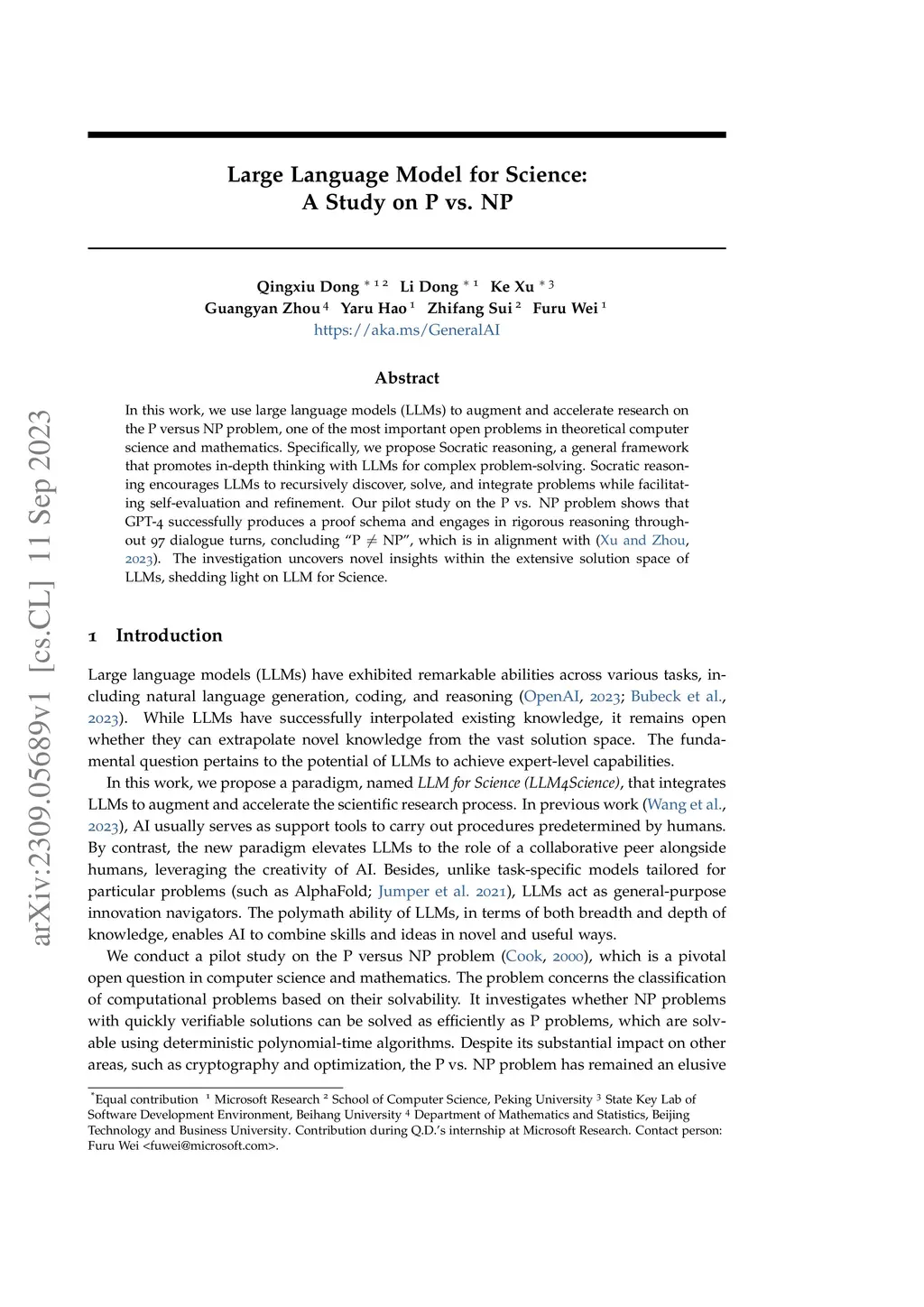 In this work, we use large language models (LLMs) to augment and accelerate research on the P versus NP problem, one of the most important open problems in theoretical computer science and mathematics. Specifically, we propose Socratic reasoning, a general framework that promotes in-depth thinking with LLMs for complex problem-solving. Socratic reasoning encourages LLMs to recursively discover, solve, and integrate problems while facilitating self-evaluation and refinement. Our pilot study on the P vs. NP problem shows that GPT-4 successfully produces a proof schema and engages in rigorous reasoning throughout 97 dialogue turns, concluding "P NP", which is in alignment with (Xu and Zhou, 2023). The investigation uncovers novel insights within the extensive solution space of LLMs, shedding light on LLM for Science.