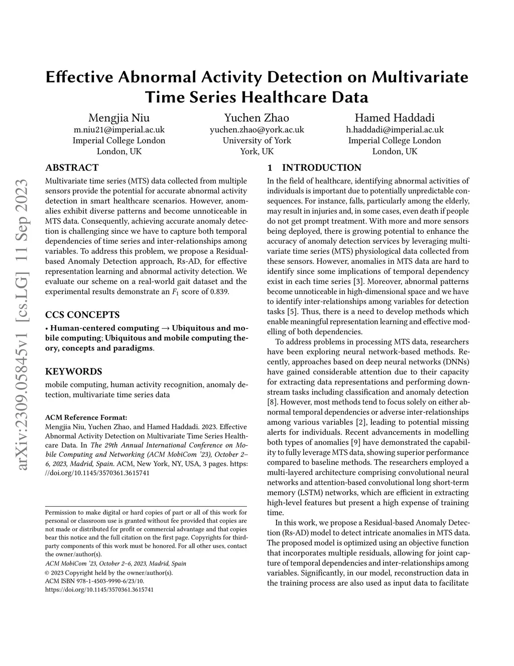Multivariate time series (MTS) data collected from multiple sensors provide the potential for accurate abnormal activity detection in smart healthcare scenarios. However, anomalies exhibit diverse patterns and become unnoticeable in MTS data. Consequently, achieving accurate anomaly detection is challenging since we have to capture both temporal dependencies of time series and inter-relationships among variables. To address this problem, we propose a Residual-based Anomaly Detection approach, Rs-AD, for effective representation learning and abnormal activity detection. We evaluate our scheme on a real-world gait dataset and the experimental results demonstrate an F1 score of 0.839.