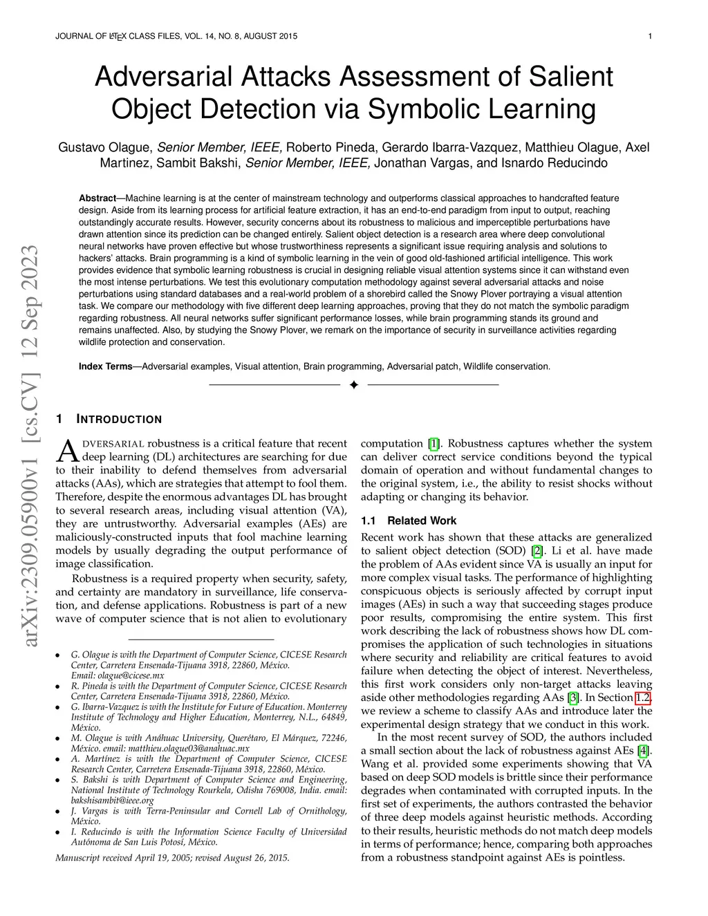 Machine learning is at the center of mainstream technology and outperforms classical approaches to handcrafted feature design. Aside from its learning process for artificial feature extraction, it has an end-to-end paradigm from input to output, reaching outstandingly accurate results. However, security concerns about its robustness to malicious and imperceptible perturbations have drawn attention since its prediction can be changed entirely. Salient object detection is a research area where deep convolutional neural networks have proven effective but whose trustworthiness represents a significant issue requiring analysis and solutions to hackers' attacks. Brain programming is a kind of symbolic learning in the vein of good old-fashioned artificial intelligence. This work provides evidence that symbolic learning robustness is crucial in designing reliable visual attention systems since it can withstand even the most intense perturbations. We test this evolutionary computation methodology against several adversarial attacks and noise perturbations using standard databases and a real-world problem of a shorebird called the Snowy Plover portraying a visual attention task. We compare our methodology with five different deep learning approaches, proving that they do not match the symbolic paradigm regarding robustness. All neural networks suffer significant performance losses, while brain programming stands its ground and remains unaffected. Also, by studying the Snowy Plover, we remark on the importance of security in surveillance activities regarding wildlife protection and conservation.