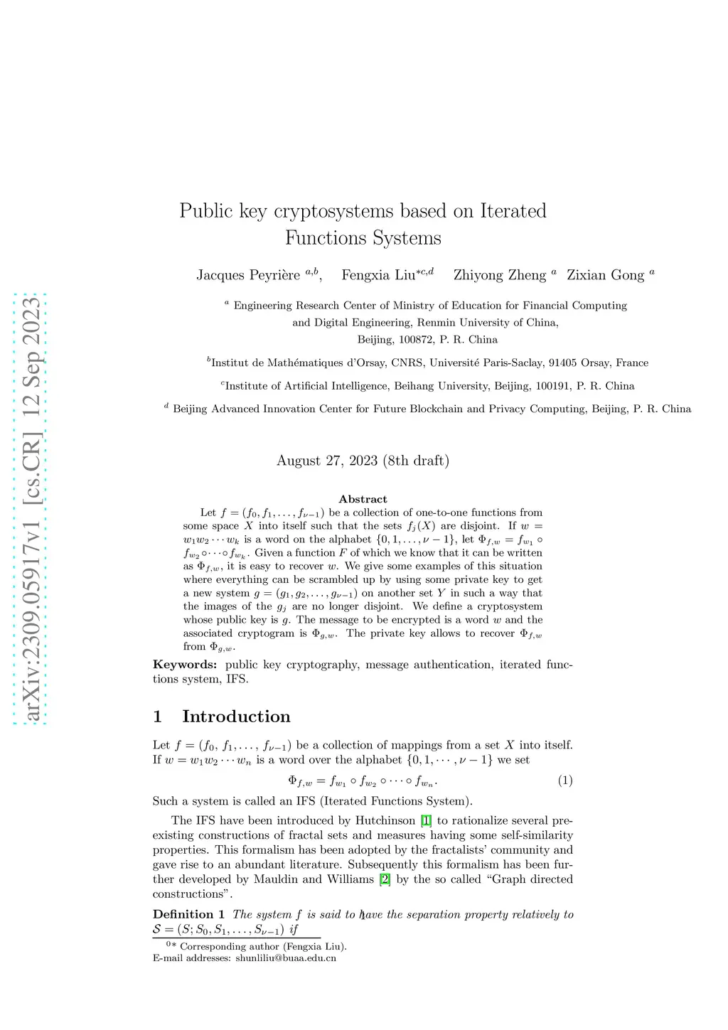 Let be a collection of one-to-one functions from some space~ into itself such that the sets are disjoint. If is a word on the alphabet , let . Given a function~ of which we know that it can be written as , it is easy to recover~. We give some examples of this situation where everything can be scrambled up by using some private key to get a new system on another set~ in such a way that the images of the are no longer disjoint. We define a cryptosystem whose public key is~. The message to be encrypted is a word~ and the associated cryptogram is . The private key allows to recover from .