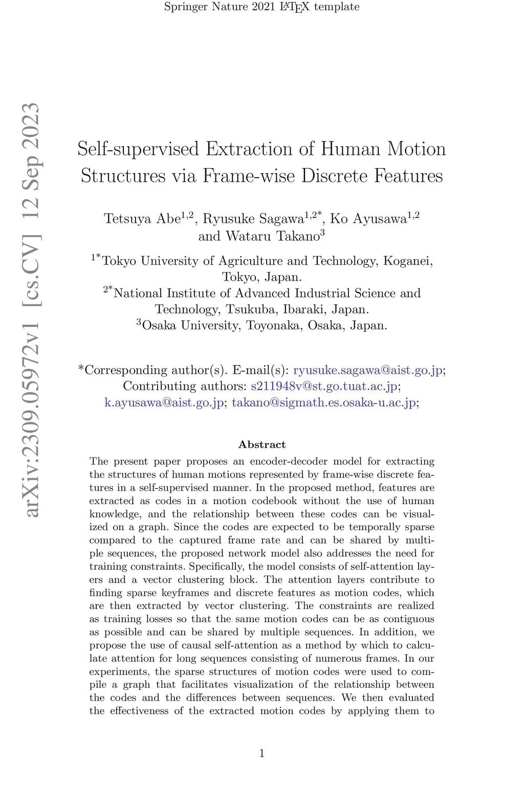 The present paper proposes an encoder-decoder model for extracting the structures of human motions represented by frame-wise discrete features in a self-supervised manner. In the proposed method, features are extracted as codes in a motion codebook without the use of human knowledge, and the relationship between these codes can be visualized on a graph. Since the codes are expected to be temporally sparse compared to the captured frame rate and can be shared by multiple sequences, the proposed network model also addresses the need for training constraints. Specifically, the model consists of self-attention layers and a vector clustering block. The attention layers contribute to finding sparse keyframes and discrete features as motion codes, which are then extracted by vector clustering. The constraints are realized as training losses so that the same motion codes can be as contiguous as possible and can be shared by multiple sequences. In addition, we propose the use of causal self-attention as a method by which to calculate attention for long sequences consisting of numerous frames. In our experiments, the sparse structures of motion codes were used to compile a graph that facilitates visualization of the relationship between the codes and the differences between sequences. We then evaluated the effectiveness of the extracted motion codes by applying them to multiple recognition tasks and found that performance levels comparable to task-optimized methods could be achieved by linear probing.