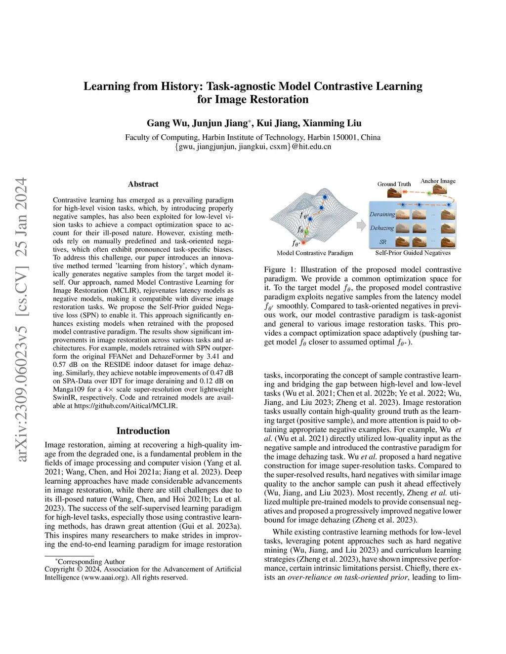 Contrastive learning has emerged as a prevailing paradigm for high-level vision tasks, which, by introducing properly negative samples, has also been exploited for low-level vision tasks to achieve a compact optimization space to account for their ill-posed nature. However, existing methods rely on manually predefined and task-oriented negatives, which often exhibit pronounced task-specific biases. To address this challenge, our paper introduces an innovative method termed 'learning from history', which dynamically generates negative samples from the target model itself. Our approach, named Model Contrastive Learning for Image Restoration (MCLIR), rejuvenates latency models as negative models, making it compatible with diverse image restoration tasks. We propose the Self-Prior guided Negative loss (SPN) to enable it. This approach significantly enhances existing models when retrained with the proposed model contrastive paradigm. The results show significant improvements in image restoration across various tasks and architectures. For example, models retrained with SPN outperform the original FFANet and DehazeFormer by 3.41 dB and 0.57 dB on the RESIDE indoor dataset for image dehazing. Similarly, they achieve notable improvements of 0.47 dB on SPA-Data over IDT for image deraining and 0.12 dB on Manga109 for a 4x scale super-resolution over lightweight SwinIR, respectively. Code and retrained models are available at https://github.com/Aitical/MCLIR.