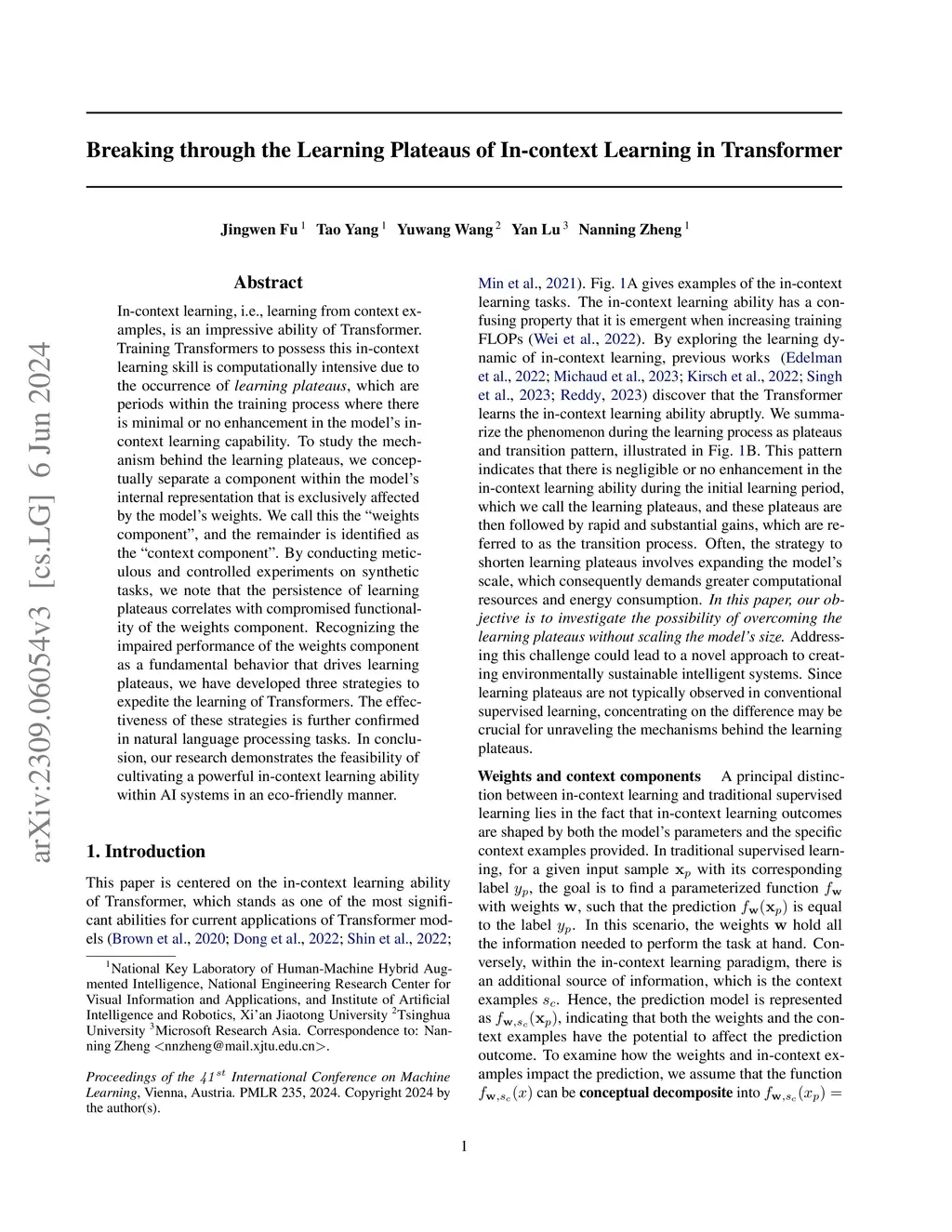 In-context learning, i.e., learning from context examples, is an impressive ability of Transformer. Training Transformers to possess this in-context learning skill is computationally intensive due to the occurrence of learning plateaus, which are periods within the training process where there is minimal or no enhancement in the model's in-context learning capability. To study the mechanism behind the learning plateaus, we conceptually seperate a component within the model's internal representation that is exclusively affected by the model's weights. We call this the "weights component", and the remainder is identified as the "context component". By conducting meticulous and controlled experiments on synthetic tasks, we note that the persistence of learning plateaus correlates with compromised functionality of the weights component. Recognizing the impaired performance of the weights component as a fundamental behavior drives learning plateaus, we have developed three strategies to expedite the learning of Transformers. The effectiveness of these strategies is further confirmed in natural language processing tasks. In conclusion, our research demonstrates the feasibility of cultivating a powerful in-context learning ability within AI systems in an eco-friendly manner.