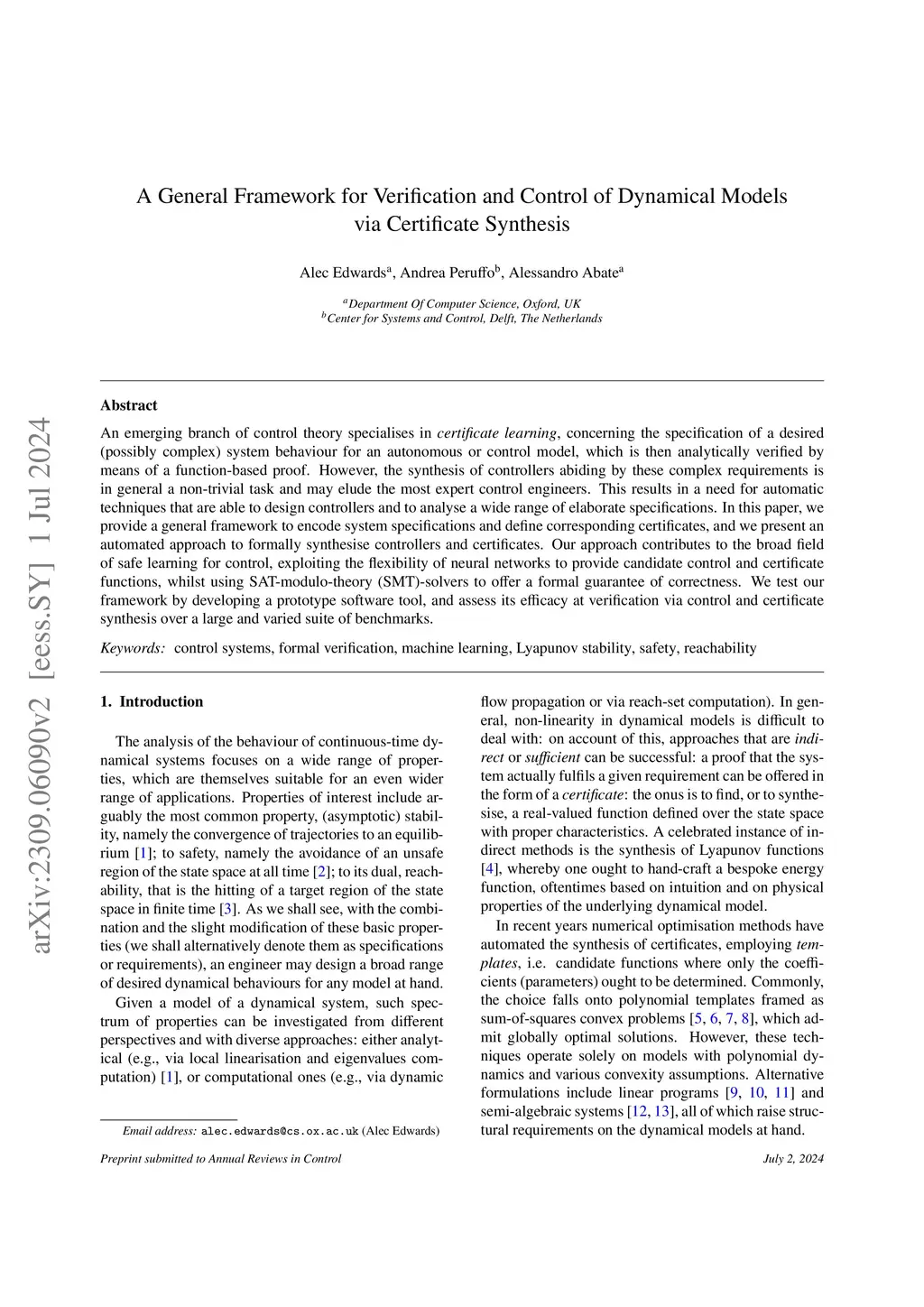 An emerging branch of control theory specialises in certificate learning, concerning the specification of a desired (possibly complex) system behaviour for an autonomous or control model, which is then analytically verified by means of a function-based proof. However, the synthesis of controllers abiding by these complex requirements is in general a non-trivial task and may elude the most expert control engineers. This results in a need for automatic techniques that are able to design controllers and to analyse a wide range of elaborate specifications. In this paper, we provide a general framework to encode system specifications and define corresponding certificates, and we present an automated approach to formally synthesise controllers and certificates. Our approach contributes to the broad field of safe learning for control, exploiting the flexibility of neural networks to provide candidate control and certificate functions, whilst using SMT-solvers to offer a formal guarantee of correctness. We test our framework by developing a prototype software tool, and assess its efficacy at verification via control and certificate synthesis over a large and varied suite of benchmarks.