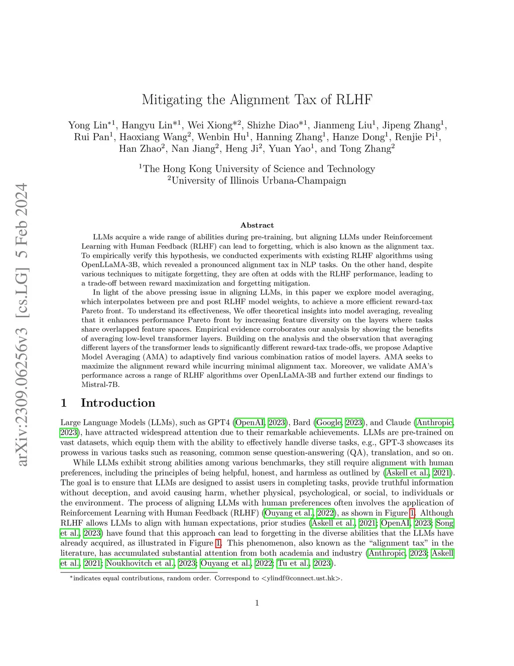 LLMs acquire a wide range of abilities during pre-training, but aligning LLMs under Reinforcement Learning with Human Feedback (RLHF) can lead to forgetting, which is also known as the alignment tax. To empirically verify this hypothesis, we conducted experiments with existing RLHF algorithms using OpenLLaMA-3B, which revealed a pronounced alignment tax in NLP tasks. On the other hand, despite various techniques to mitigate forgetting, they are often at odds with the RLHF performance, leading to a trade-off between reward maximization and forgetting mitigation. In light of the above pressing issue in aligning LLMs, in this paper we explore model averaging, which interpolates between pre and post RLHF model weights, to achieve a more efficient reward-tax Pareto front. To understand its effectiveness, We offer theoretical insights into model averaging, revealing that it enhances performance Pareto front by increasing feature diversity on the layers where tasks share overlapped feature spaces. Empirical evidence corroborates our analysis by showing the benefits of averaging low-level transformer layers. Building on the analysis and the observation that averaging different layers of the transformer leads to significantly different reward-tax trade-offs, we propose Adaptive Model Averaging (AMA) to adaptively find various combination ratios of model layers. AMA seeks to maximize the alignment reward while incurring minimal alignment tax. Moreover, we validate AMA's performance across a range of RLHF algorithms over OpenLLaMA-3B and further extend our findings to Mistral-7B.