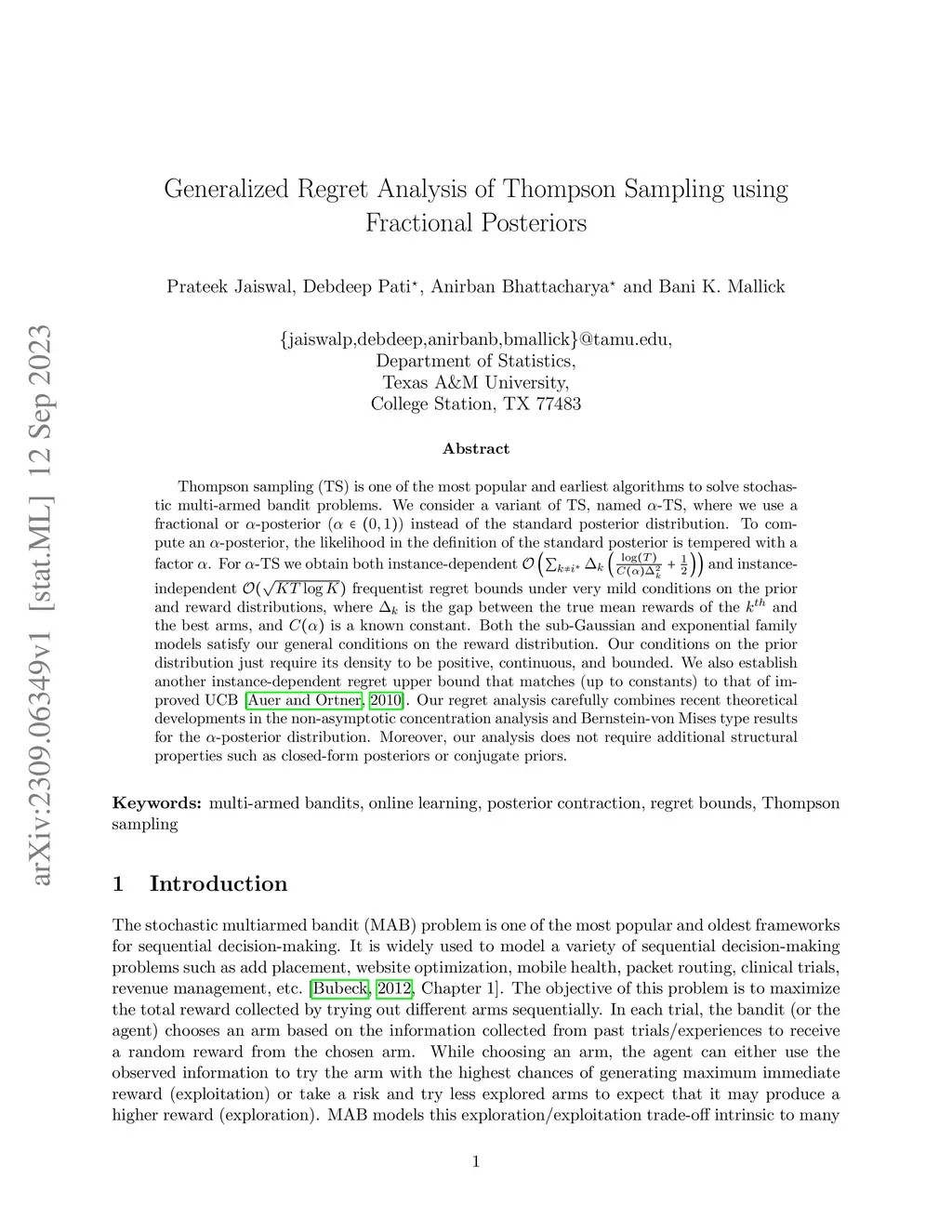 Thompson sampling (TS) is one of the most popular and earliest algorithms to solve stochastic multi-armed bandit problems. We consider a variant of TS, named -TS, where we use a fractional or -posterior () instead of the standard posterior distribution. To compute an -posterior, the likelihood in the definition of the standard posterior is tempered with a factor . For -TS we obtain both instance-dependent and instance-independent frequentist regret bounds under very mild conditions on the prior and reward distributions, where is the gap between the true mean rewards of the and the best arms, and is a known constant. Both the sub-Gaussian and exponential family models satisfy our general conditions on the reward distribution. Our conditions on the prior distribution just require its density to be positive, continuous, and bounded. We also establish another instance-dependent regret upper bound that matches (up to constants) to that of improved UCB [Auer and Ortner, 2010]. Our regret analysis carefully combines recent theoretical developments in the non-asymptotic concentration analysis and Bernstein-von Mises type results for the -posterior distribution. Moreover, our analysis does not require additional structural properties such as closed-form posteriors or conjugate priors.