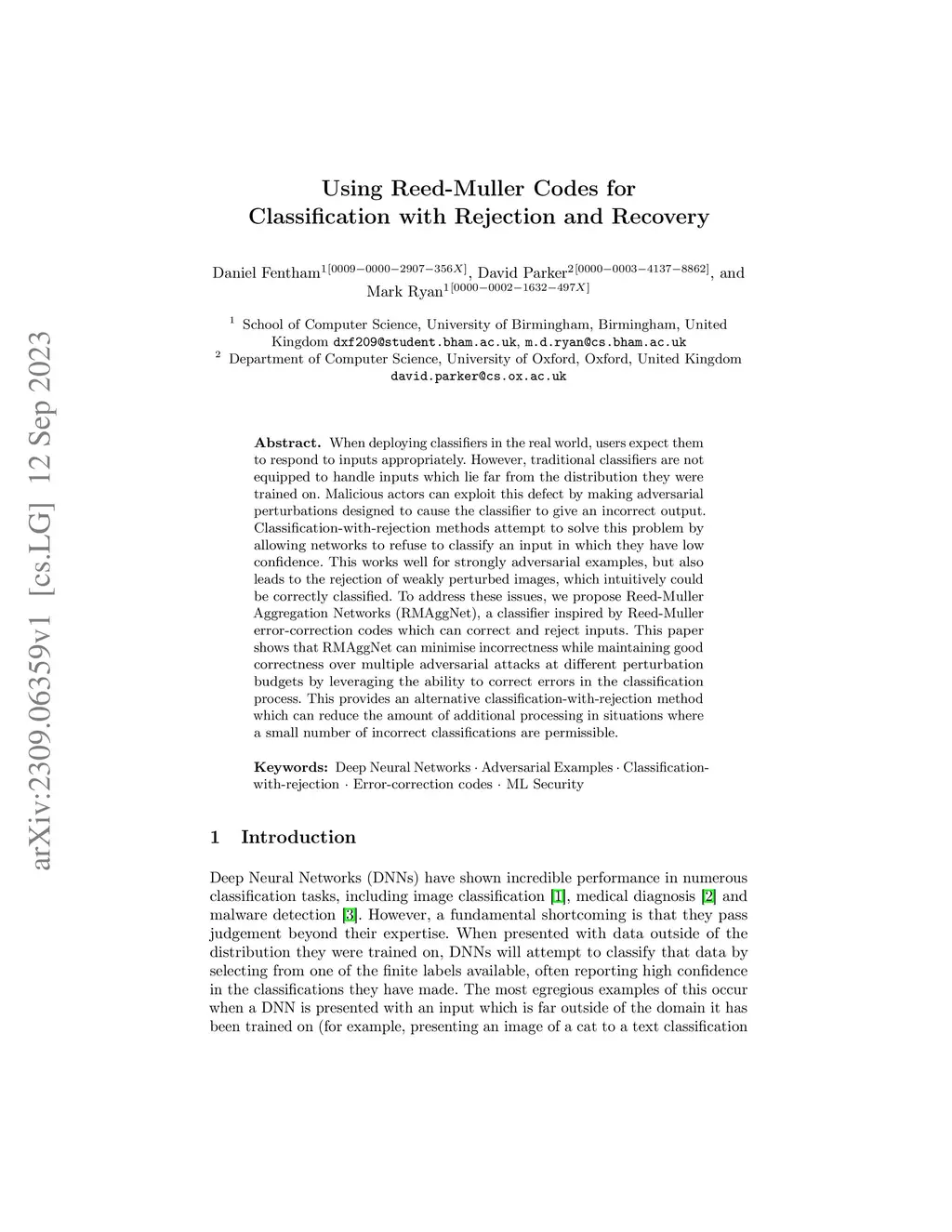 When deploying classifiers in the real world, users expect them to respond to inputs appropriately. However, traditional classifiers are not equipped to handle inputs which lie far from the distribution they were trained on. Malicious actors can exploit this defect by making adversarial perturbations designed to cause the classifier to give an incorrect output. Classification-with-rejection methods attempt to solve this problem by allowing networks to refuse to classify an input in which they have low confidence. This works well for strongly adversarial examples, but also leads to the rejection of weakly perturbed images, which intuitively could be correctly classified. To address these issues, we propose Reed-Muller Aggregation Networks (RMAggNet), a classifier inspired by Reed-Muller error-correction codes which can correct and reject inputs. This paper shows that RMAggNet can minimise incorrectness while maintaining good correctness over multiple adversarial attacks at different perturbation budgets by leveraging the ability to correct errors in the classification process. This provides an alternative classification-with-rejection method which can reduce the amount of additional processing in situations where a small number of incorrect classifications are permissible.
