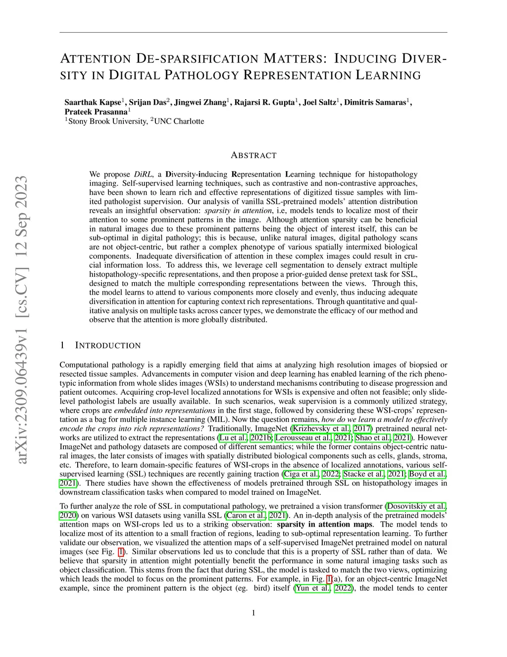 We propose DiRL, a Diversity-inducing Representation Learning technique for histopathology imaging. Self-supervised learning techniques, such as contrastive and non-contrastive approaches, have been shown to learn rich and effective representations of digitized tissue samples with limited pathologist supervision. Our analysis of vanilla SSL-pretrained models' attention distribution reveals an insightful observation: sparsity in attention, i.e, models tends to localize most of their attention to some prominent patterns in the image. Although attention sparsity can be beneficial in natural images due to these prominent patterns being the object of interest itself, this can be sub-optimal in digital pathology; this is because, unlike natural images, digital pathology scans are not object-centric, but rather a complex phenotype of various spatially intermixed biological components. Inadequate diversification of attention in these complex images could result in crucial information loss. To address this, we leverage cell segmentation to densely extract multiple histopathology-specific representations, and then propose a prior-guided dense pretext task for SSL, designed to match the multiple corresponding representations between the views. Through this, the model learns to attend to various components more closely and evenly, thus inducing adequate diversification in attention for capturing context rich representations. Through quantitative and qualitative analysis on multiple tasks across cancer types, we demonstrate the efficacy of our method and observe that the attention is more globally distributed.