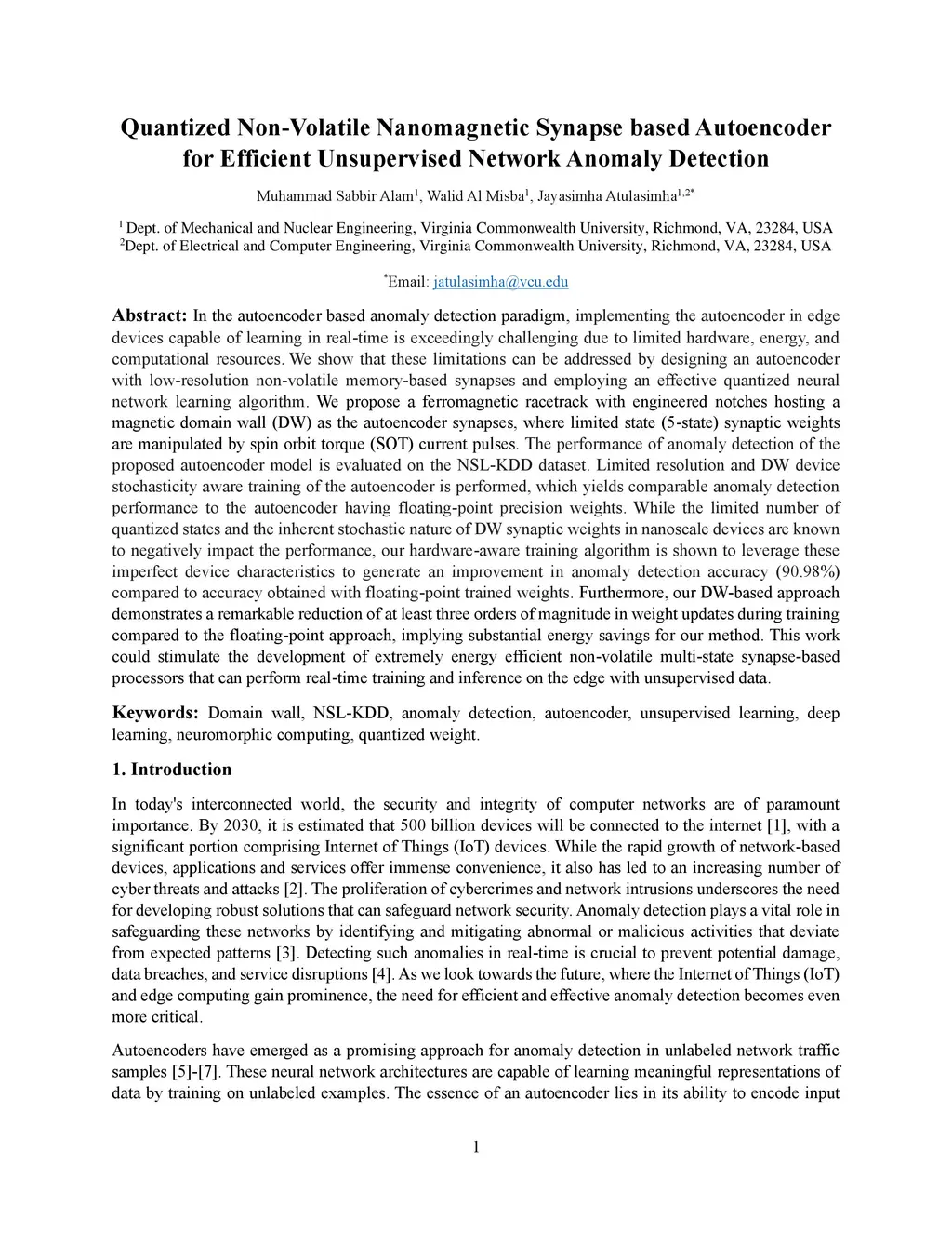 In the autoencoder based anomaly detection paradigm, implementing the autoencoder in edge devices capable of learning in real-time is exceedingly challenging due to limited hardware, energy, and computational resources. We show that these limitations can be addressed by designing an autoencoder with low-resolution non-volatile memory-based synapses and employing an effective quantized neural network learning algorithm. We propose a ferromagnetic racetrack with engineered notches hosting a magnetic domain wall (DW) as the autoencoder synapses, where limited state (5-state) synaptic weights are manipulated by spin orbit torque (SOT) current pulses. The performance of anomaly detection of the proposed autoencoder model is evaluated on the NSL-KDD dataset. Limited resolution and DW device stochasticity aware training of the autoencoder is performed, which yields comparable anomaly detection performance to the autoencoder having floating-point precision weights. While the limited number of quantized states and the inherent stochastic nature of DW synaptic weights in nanoscale devices are known to negatively impact the performance, our hardware-aware training algorithm is shown to leverage these imperfect device characteristics to generate an improvement in anomaly detection accuracy (90.98%) compared to accuracy obtained with floating-point trained weights. Furthermore, our DW-based approach demonstrates a remarkable reduction of at least three orders of magnitude in weight updates during training compared to the floating-point approach, implying substantial energy savings for our method. This work could stimulate the development of extremely energy efficient non-volatile multi-state synapse-based processors that can perform real-time training and inference on the edge with unsupervised data.
