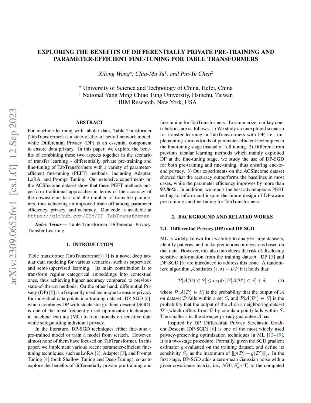 For machine learning with tabular data, Table Transformer (TabTransformer) is a state-of-the-art neural network model, while Differential Privacy (DP) is an essential component to ensure data privacy. In this paper, we explore the benefits of combining these two aspects together in the scenario of transfer learning -- differentially private pre-training and fine-tuning of TabTransformers with a variety of parameter-efficient fine-tuning (PEFT) methods, including Adapter, LoRA, and Prompt Tuning. Our extensive experiments on the ACSIncome dataset show that these PEFT methods outperform traditional approaches in terms of the accuracy of the downstream task and the number of trainable parameters, thus achieving an improved trade-off among parameter efficiency, privacy, and accuracy. Our code is available at github.com/IBM/DP-TabTransformer.