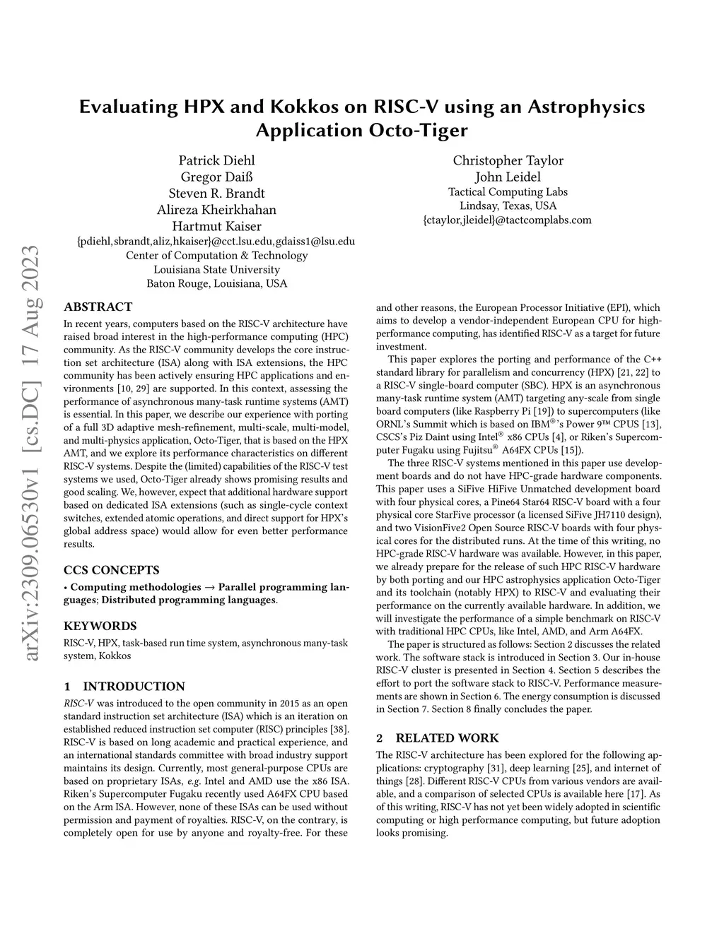 In recent years, computers based on the RISC-V architecture have raised broad interest in the high-performance computing (HPC) community. As the RISC-V community develops the core instruction set architecture (ISA) along with ISA extensions, the HPC community has been actively ensuring HPC applications and environments are supported. In this context, assessing the performance of asynchronous many-task runtime systems (AMT) is essential. In this paper, we describe our experience with porting of a full 3D adaptive mesh-refinement, multi-scale, multi-model, and multi-physics application, Octo-Tiger, that is based on the HPX AMT, and we explore its performance characteristics on different RISC-V systems. Considering the (limited) capabilities of the RISC-V test systems we used, Octo-Tiger already shows promising results and good scaling. We, however, expect that exceptional hardware support based on dedicated ISA extensions (such as single-cycle context switches, extended atomic operations, and direct support for HPX's global address space) would allow for even better performance results.