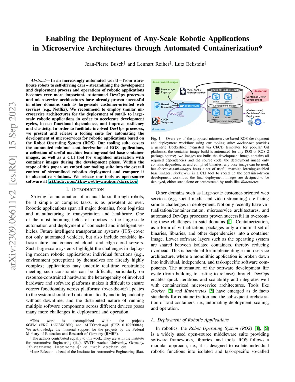 In an increasingly automated world -- from warehouse robots to self-driving cars -- streamlining the development and deployment process and operations of robotic applications becomes ever more important. Automated DevOps processes and microservice architectures have already proven successful in other domains such as large-scale customer-oriented web services (e.g., Netflix). We recommend to employ similar microservice architectures for the deployment of small- to large-scale robotic applications in order to accelerate development cycles, loosen functional dependence, and improve resiliency and elasticity. In order to facilitate involved DevOps processes, we present and release a tooling suite for automating the development of microservices for robotic applications based on the Robot Operating System (ROS). Our tooling suite covers the automated minimal containerization of ROS applications, a collection of useful machine learning-enabled base container images, as well as a CLI tool for simplified interaction with container images during the development phase. Within the scope of this paper, we embed our tooling suite into the overall context of streamlined robotics deployment and compare it to alternative solutions. We release our tools as open-source software at https://github.com/ika-rwth-aachen/dorotos.