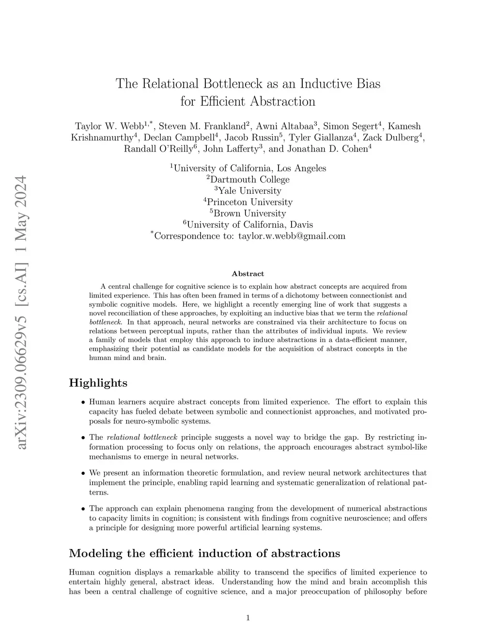 A central challenge for cognitive science is to explain how abstract concepts are acquired from limited experience. This has often been framed in terms of a dichotomy between connectionist and symbolic cognitive models. Here, we highlight a recently emerging line of work that suggests a novel reconciliation of these approaches, by exploiting an inductive bias that we term the relational bottleneck. In that approach, neural networks are constrained via their architecture to focus on relations between perceptual inputs, rather than the attributes of individual inputs. We review a family of models that employ this approach to induce abstractions in a data-efficient manner, emphasizing their potential as candidate models for the acquisition of abstract concepts in the human mind and brain.
