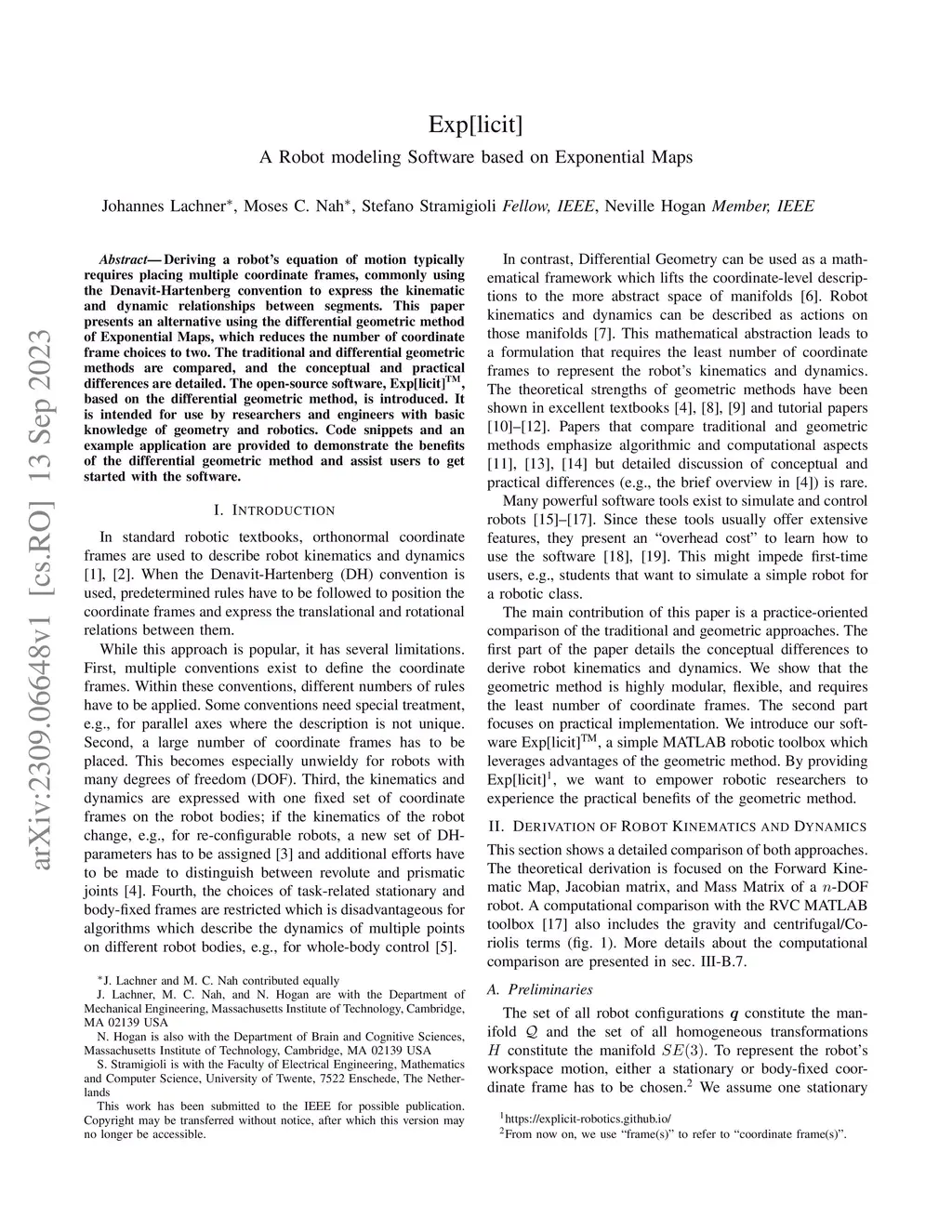 $ $Deriving a robot's equation of motion typically requires placing multiple coordinate frames, commonly using the Denavit-Hartenberg convention to express the kinematic and dynamic relationships between segments. This paper presents an alternative using the differential geometric method of Exponential Maps, which reduces the number of coordinate frame choices to two. The traditional and differential geometric methods are compared, and the conceptual and practical differences are detailed. The open-source software, Exp[licit], based on the differential geometric method, is introduced. It is intended for use by researchers and engineers with basic knowledge of geometry and robotics. Code snippets and an example application are provided to demonstrate the benefits of the differential geometric method and assist users to get started with the software.