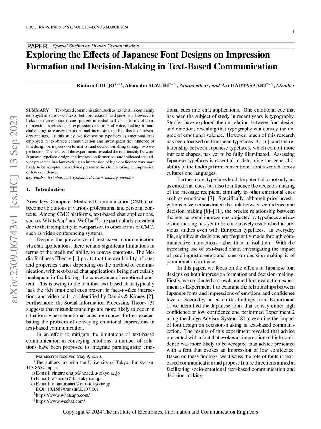 Text-based communication, such as text chat, is commonly employed in various contexts, both professional and personal. However, it lacks the rich emotional cues present in verbal and visual forms of communication, such as facial expressions and tone of voice, making it more challenging to convey emotions and increasing the likelihood of misunderstandings. In this study, we focused on typefaces as emotional cues employed in text-based communication and investigated the influence of font design on impression formation and decision-making through two experiments. The results of the experiments revealed the relationship between Japanese typeface design and impression formation, and indicated that advice presented in a font evoking an impression of high confidence was more likely to be accepted than advice presented in a font evoking an impression of low confidence.