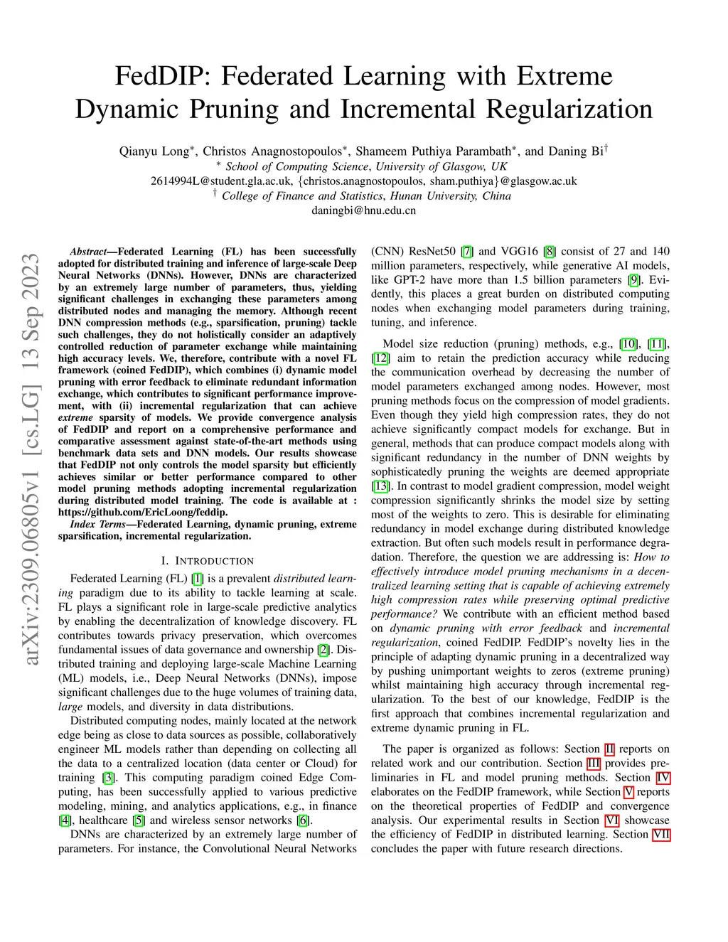 Federated Learning (FL) has been successfully adopted for distributed training and inference of large-scale Deep Neural Networks (DNNs). However, DNNs are characterized by an extremely large number of parameters, thus, yielding significant challenges in exchanging these parameters among distributed nodes and managing the memory. Although recent DNN compression methods (e.g., sparsification, pruning) tackle such challenges, they do not holistically consider an adaptively controlled reduction of parameter exchange while maintaining high accuracy levels. We, therefore, contribute with a novel FL framework (coined FedDIP), which combines (i) dynamic model pruning with error feedback to eliminate redundant information exchange, which contributes to significant performance improvement, with (ii) incremental regularization that can achieve \textit{extreme} sparsity of models. We provide convergence analysis of FedDIP and report on a comprehensive performance and comparative assessment against state-of-the-art methods using benchmark data sets and DNN models. Our results showcase that FedDIP not only controls the model sparsity but efficiently achieves similar or better performance compared to other model pruning methods adopting incremental regularization during distributed model training. The code is available at: https://github.com/EricLoong/feddip.