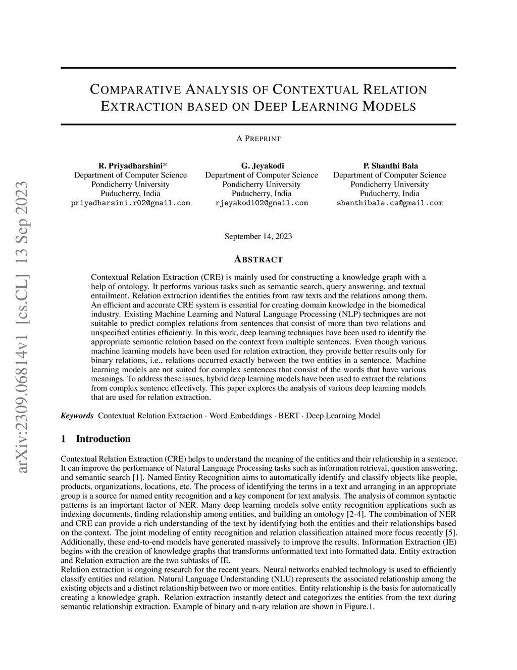 Contextual Relation Extraction (CRE) is mainly used for constructing a knowledge graph with a help of ontology. It performs various tasks such as semantic search, query answering, and textual entailment. Relation extraction identifies the entities from raw texts and the relations among them. An efficient and accurate CRE system is essential for creating domain knowledge in the biomedical industry. Existing Machine Learning and Natural Language Processing (NLP) techniques are not suitable to predict complex relations from sentences that consist of more than two relations and unspecified entities efficiently. In this work, deep learning techniques have been used to identify the appropriate semantic relation based on the context from multiple sentences. Even though various machine learning models have been used for relation extraction, they provide better results only for binary relations, i.e., relations occurred exactly between the two entities in a sentence. Machine learning models are not suited for complex sentences that consist of the words that have various meanings. To address these issues, hybrid deep learning models have been used to extract the relations from complex sentence effectively. This paper explores the analysis of various deep learning models that are used for relation extraction.
