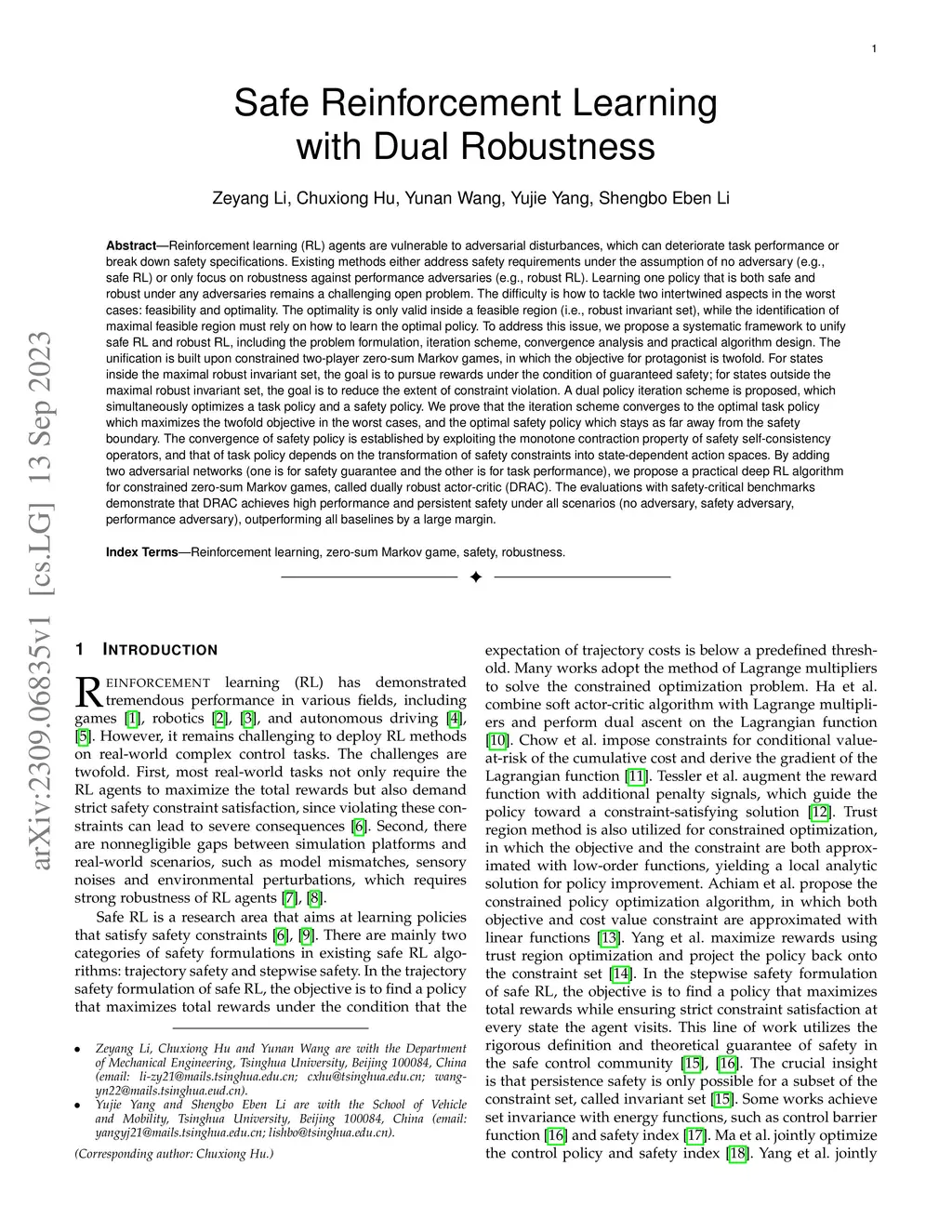 Reinforcement learning (RL) agents are vulnerable to adversarial disturbances, which can deteriorate task performance or compromise safety specifications. Existing methods either address safety requirements under the assumption of no adversary (e.g., safe RL) or only focus on robustness against performance adversaries (e.g., robust RL). Learning one policy that is both safe and robust remains a challenging open problem. The difficulty is how to tackle two intertwined aspects in the worst cases: feasibility and optimality. Optimality is only valid inside a feasible region, while identification of maximal feasible region must rely on learning the optimal policy. To address this issue, we propose a systematic framework to unify safe RL and robust RL, including problem formulation, iteration scheme, convergence analysis and practical algorithm design. This unification is built upon constrained two-player zero-sum Markov games. A dual policy iteration scheme is proposed, which simultaneously optimizes a task policy and a safety policy. The convergence of this iteration scheme is proved. Furthermore, we design a deep RL algorithm for practical implementation, called dually robust actor-critic (DRAC). The evaluations with safety-critical benchmarks demonstrate that DRAC achieves high performance and persistent safety under all scenarios (no adversary, safety adversary, performance adversary), outperforming all baselines significantly.