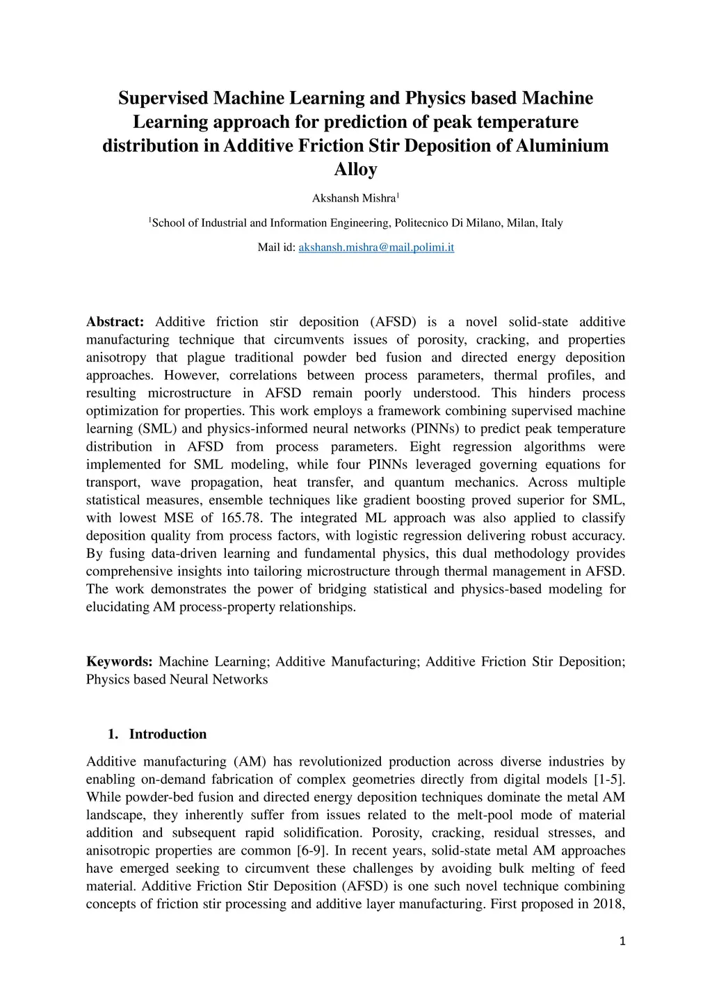 Additive friction stir deposition (AFSD) is a novel solid-state additive manufacturing technique that circumvents issues of porosity, cracking, and properties anisotropy that plague traditional powder bed fusion and directed energy deposition approaches. However, correlations between process parameters, thermal profiles, and resulting microstructure in AFSD remain poorly understood. This hinders process optimization for properties. This work employs a framework combining supervised machine learning (SML) and physics-informed neural networks (PINNs) to predict peak temperature distribution in AFSD from process parameters. Eight regression algorithms were implemented for SML modeling, while four PINNs leveraged governing equations for transport, wave propagation, heat transfer, and quantum mechanics. Across multiple statistical measures, ensemble techniques like gradient boosting proved superior for SML, with lowest MSE of 165.78. The integrated ML approach was also applied to classify deposition quality from process factors, with logistic regression delivering robust accuracy. By fusing data-driven learning and fundamental physics, this dual methodology provides comprehensive insights into tailoring microstructure through thermal management in AFSD. The work demonstrates the power of bridging statistical and physics-based modeling for elucidating AM process-property relationships.