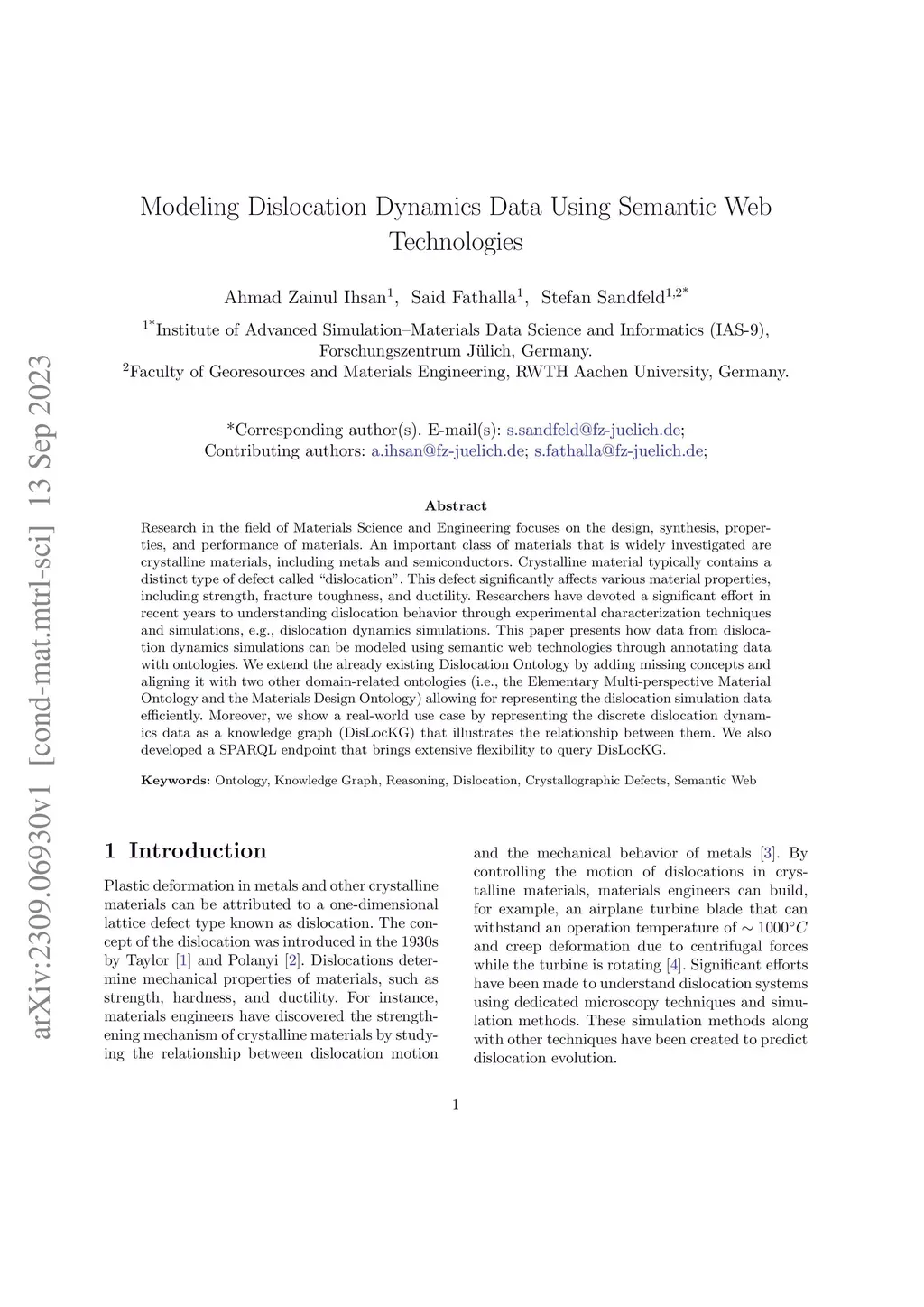Modeling Dislocation Dynamics Data Using Semantic Web Technologies