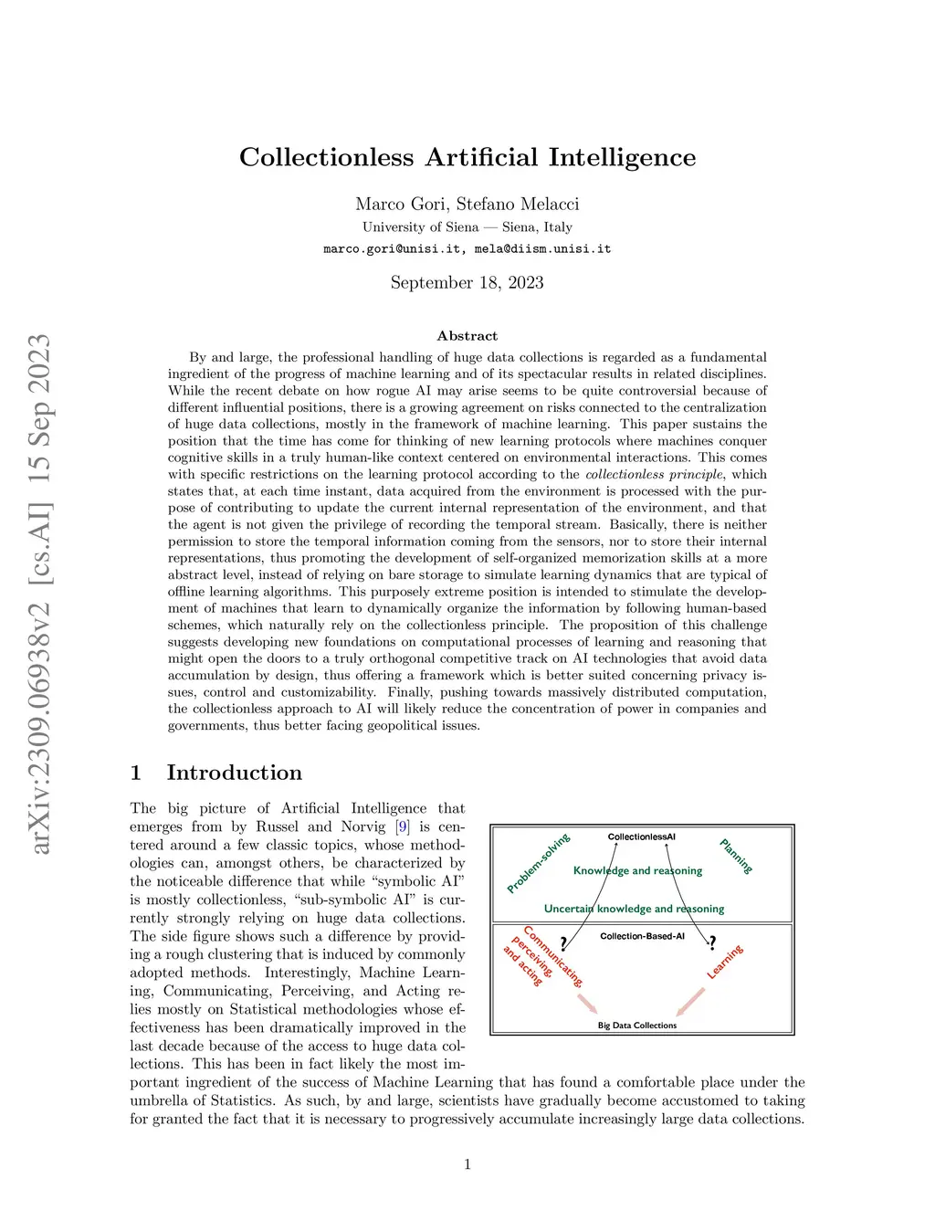By and large, the professional handling of huge data collections is regarded as a fundamental ingredient of the progress of machine learning and of its spectacular results in related disciplines, with a growing agreement on risks connected to the centralization of such data collections. This paper sustains the position that the time has come for thinking of new learning protocols where machines conquer cognitive skills in a truly human-like context centered on environmental interactions. This comes with specific restrictions on the learning protocol according to the collectionless principle, which states that, at each time instant, data acquired from the environment is processed with the purpose of contributing to update the current internal representation of the environment, and that the agent is not given the privilege of recording the temporal stream. Basically, there is neither permission to store the temporal information coming from the sensors, thus promoting the development of self-organized memorization skills at a more abstract level, instead of relying on bare storage to simulate learning dynamics that are typical of offline learning algorithms. This purposely extreme position is intended to stimulate the development of machines that learn to dynamically organize the information by following human-based schemes. The proposition of this challenge suggests developing new foundations on computational processes of learning and reasoning that might open the doors to a truly orthogonal competitive track on AI technologies that avoid data accumulation by design, thus offering a framework which is better suited concerning privacy issues, control and customizability. Finally, pushing towards massively distributed computation, the collectionless approach to AI will likely reduce the concentration of power in companies and governments, thus better facing geopolitical issues.