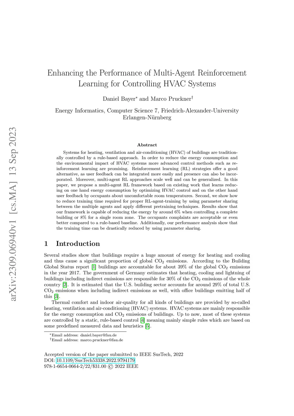 Systems for heating, ventilation and air-conditioning (HVAC) of buildings are traditionally controlled by a rule-based approach. In order to reduce the energy consumption and the environmental impact of HVAC systems more advanced control methods such as reinforcement learning are promising. Reinforcement learning (RL) strategies offer a good alternative, as user feedback can be integrated more easily and presence can also be incorporated. Moreover, multi-agent RL approaches scale well and can be generalized. In this paper, we propose a multi-agent RL framework based on existing work that learns reducing on one hand energy consumption by optimizing HVAC control and on the other hand user feedback by occupants about uncomfortable room temperatures. Second, we show how to reduce training time required for proper RL-agent-training by using parameter sharing between the multiple agents and apply different pretraining techniques. Results show that our framework is capable of reducing the energy by around 6% when controlling a complete building or 8% for a single room zone. The occupants complaints are acceptable or even better compared to a rule-based baseline. Additionally, our performance analysis show that the training time can be drastically reduced by using parameter sharing.