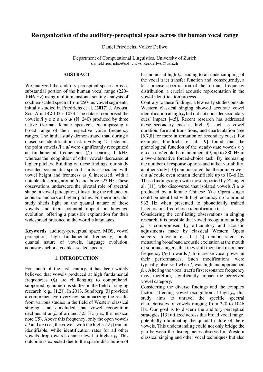 We analyzed the auditory-perceptual space across a substantial portion of the human vocal range (220-1046 Hz) using multidimensional scaling analysis of cochlea-scaled spectra from 250-ms vowel segments, initially studied in Friedrichs et al. (2017) J. Acoust. Soc. Am. 142 1025-1033. The dataset comprised the vowels /i y e {\o} {\epsilon} a o u/ (N=240) produced by three native German female speakers, encompassing a broad range of their respective voice frequency ranges. The initial study demonstrated that, during a closed-set identification task involving 21 listeners, the point vowels /i a u/ were significantly recognized at fundamental frequencies (fo) nearing 1 kHz, whereas the recognition of other vowels decreased at higher pitches. Building on these findings, our study revealed systematic spectral shifts associated with vowel height and frontness as fo increased, with a notable clustering around /i a u/ above 523 Hz. These observations underscore the pivotal role of spectral shape in vowel perception, illustrating the reliance on acoustic anchors at higher pitches. Furthermore, this study sheds light on the quantal nature of these vowels and their potential impact on language evolution, offering a plausible explanation for their widespread presence in the world's languages.
