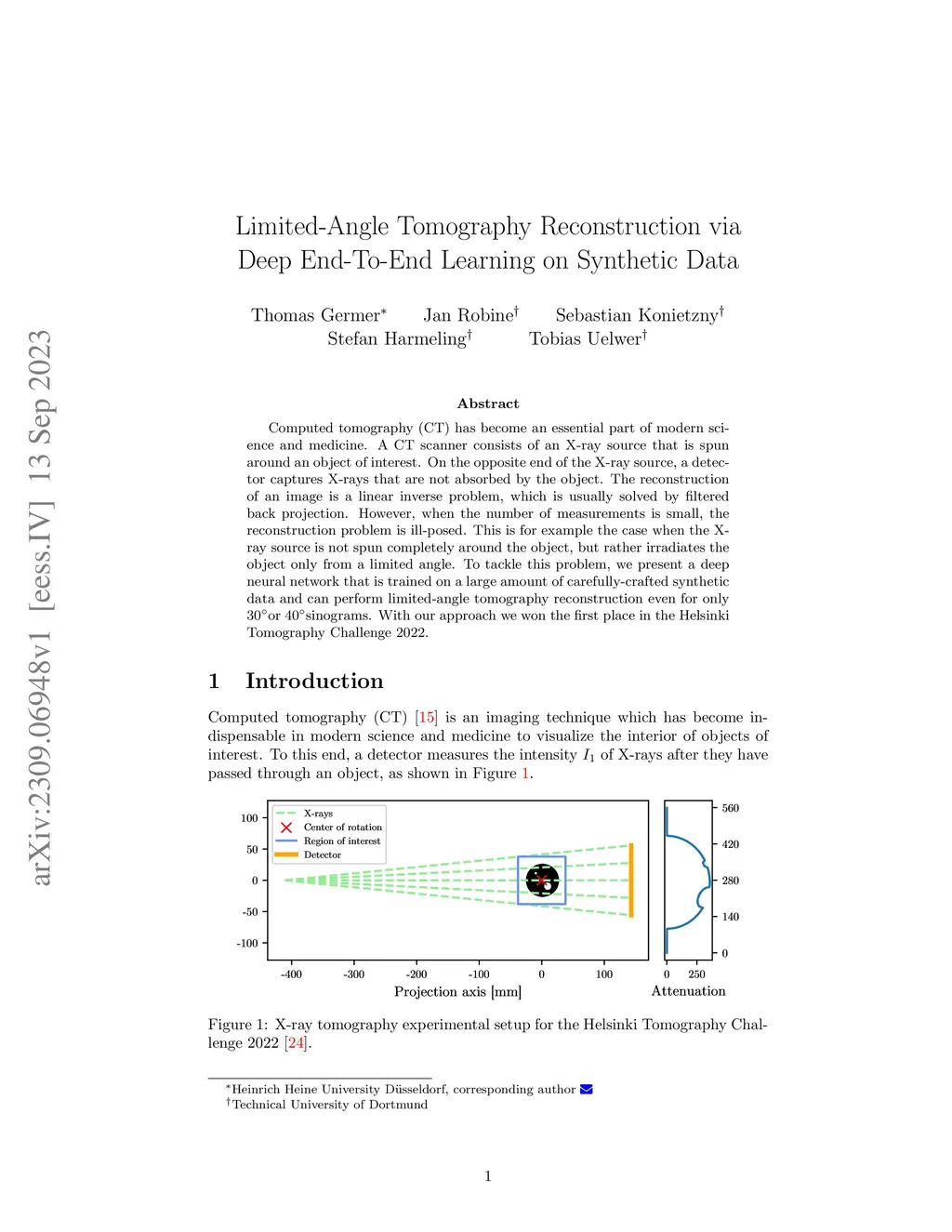 Computed tomography (CT) has become an essential part of modern science and medicine. A CT scanner consists of an X-ray source that is spun around an object of interest. On the opposite end of the X-ray source, a detector captures X-rays that are not absorbed by the object. The reconstruction of an image is a linear inverse problem, which is usually solved by filtered back projection. However, when the number of measurements is small, the reconstruction problem is ill-posed. This is for example the case when the X-ray source is not spun completely around the object, but rather irradiates the object only from a limited angle. To tackle this problem, we present a deep neural network that is trained on a large amount of carefully-crafted synthetic data and can perform limited-angle tomography reconstruction even for only 30{\deg} or 40{\deg} sinograms. With our approach we won the first place in the Helsinki Tomography Challenge 2022.