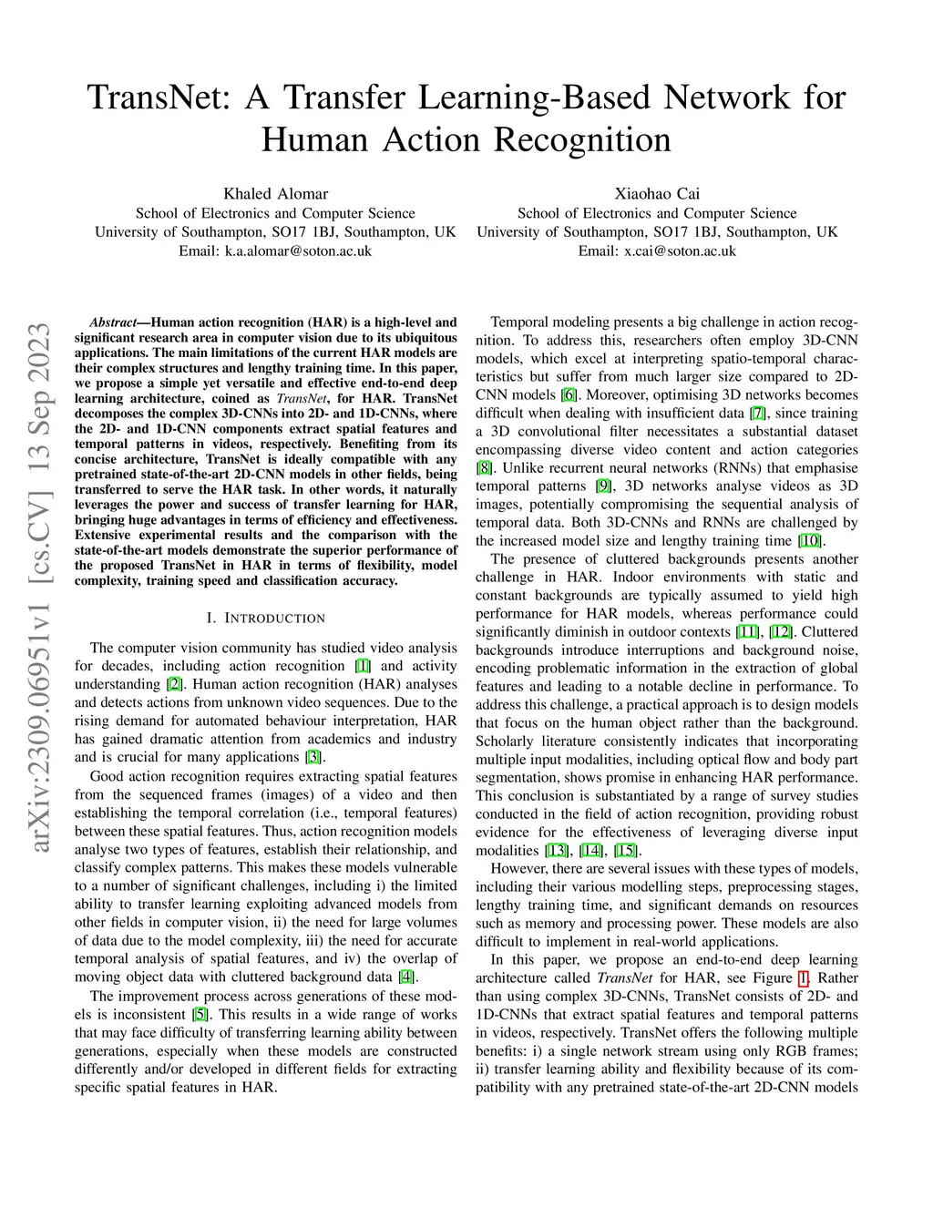 Human action recognition (HAR) is a high-level and significant research area in computer vision due to its ubiquitous applications. The main limitations of the current HAR models are their complex structures and lengthy training time. In this paper, we propose a simple yet versatile and effective end-to-end deep learning architecture, coined as TransNet, for HAR. TransNet decomposes the complex 3D-CNNs into 2D- and 1D-CNNs, where the 2D- and 1D-CNN components extract spatial features and temporal patterns in videos, respectively. Benefiting from its concise architecture, TransNet is ideally compatible with any pretrained state-of-the-art 2D-CNN models in other fields, being transferred to serve the HAR task. In other words, it naturally leverages the power and success of transfer learning for HAR, bringing huge advantages in terms of efficiency and effectiveness. Extensive experimental results and the comparison with the state-of-the-art models demonstrate the superior performance of the proposed TransNet in HAR in terms of flexibility, model complexity, training speed and classification accuracy.