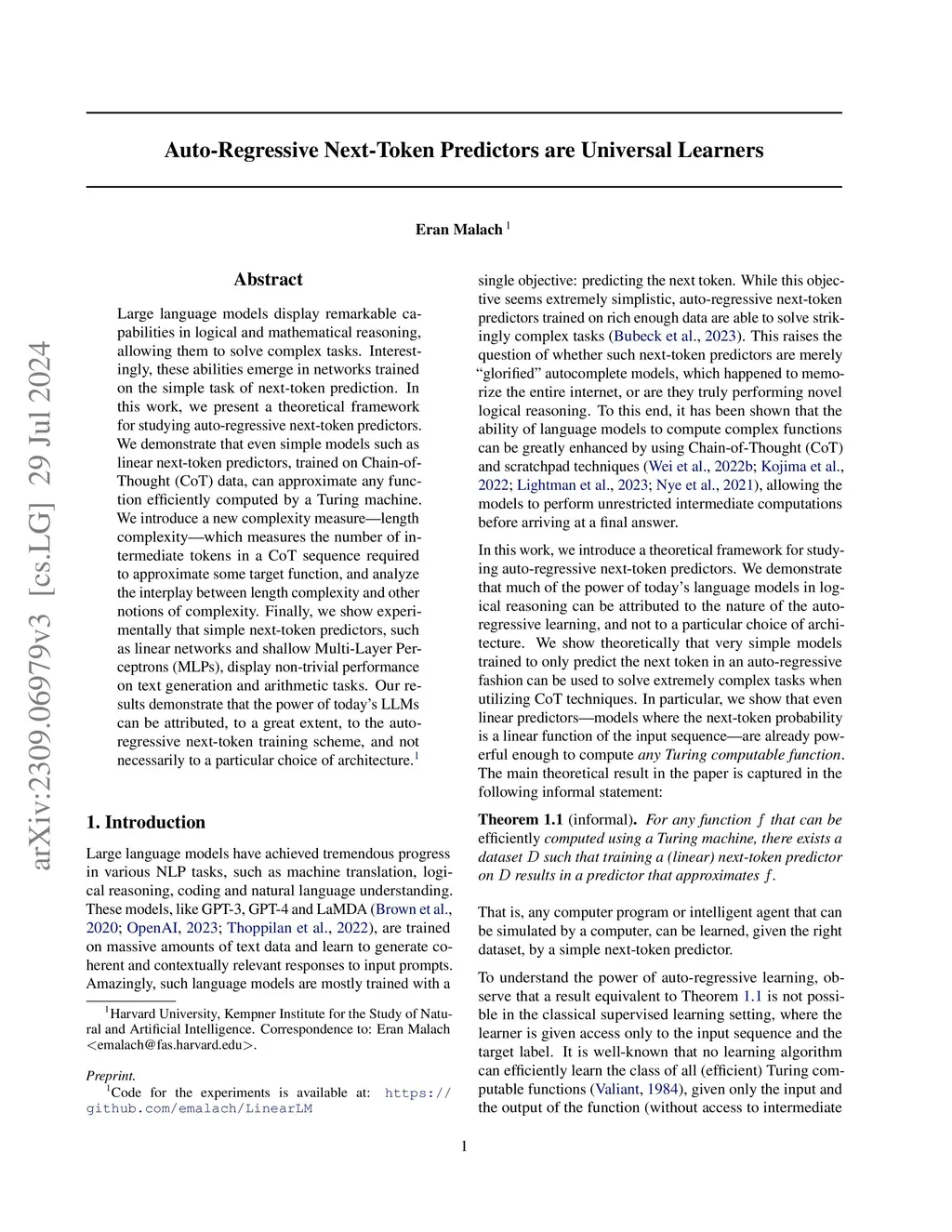 Large language models display remarkable capabilities in logical and mathematical reasoning, allowing them to solve complex tasks. Interestingly, these abilities emerge in networks trained on the simple task of next-token prediction. In this work, we present a theoretical framework for studying auto-regressive next-token predictors. We demonstrate that even simple models such as linear next-token predictors, trained on Chain-of-Thought (CoT) data, can approximate any function efficiently computed by a Turing machine. We introduce a new complexity measure -- length complexity -- which measures the number of intermediate tokens in a CoT sequence required to approximate some target function, and analyze the interplay between length complexity and other notions of complexity. Finally, we show experimentally that simple next-token predictors, such as linear networks and shallow Multi-Layer Perceptrons (MLPs), display non-trivial performance on text generation and arithmetic tasks. Our results demonstrate that the power of today's LLMs can be attributed, to a great extent, to the auto-regressive next-token training scheme, and not necessarily to a particular choice of architecture.