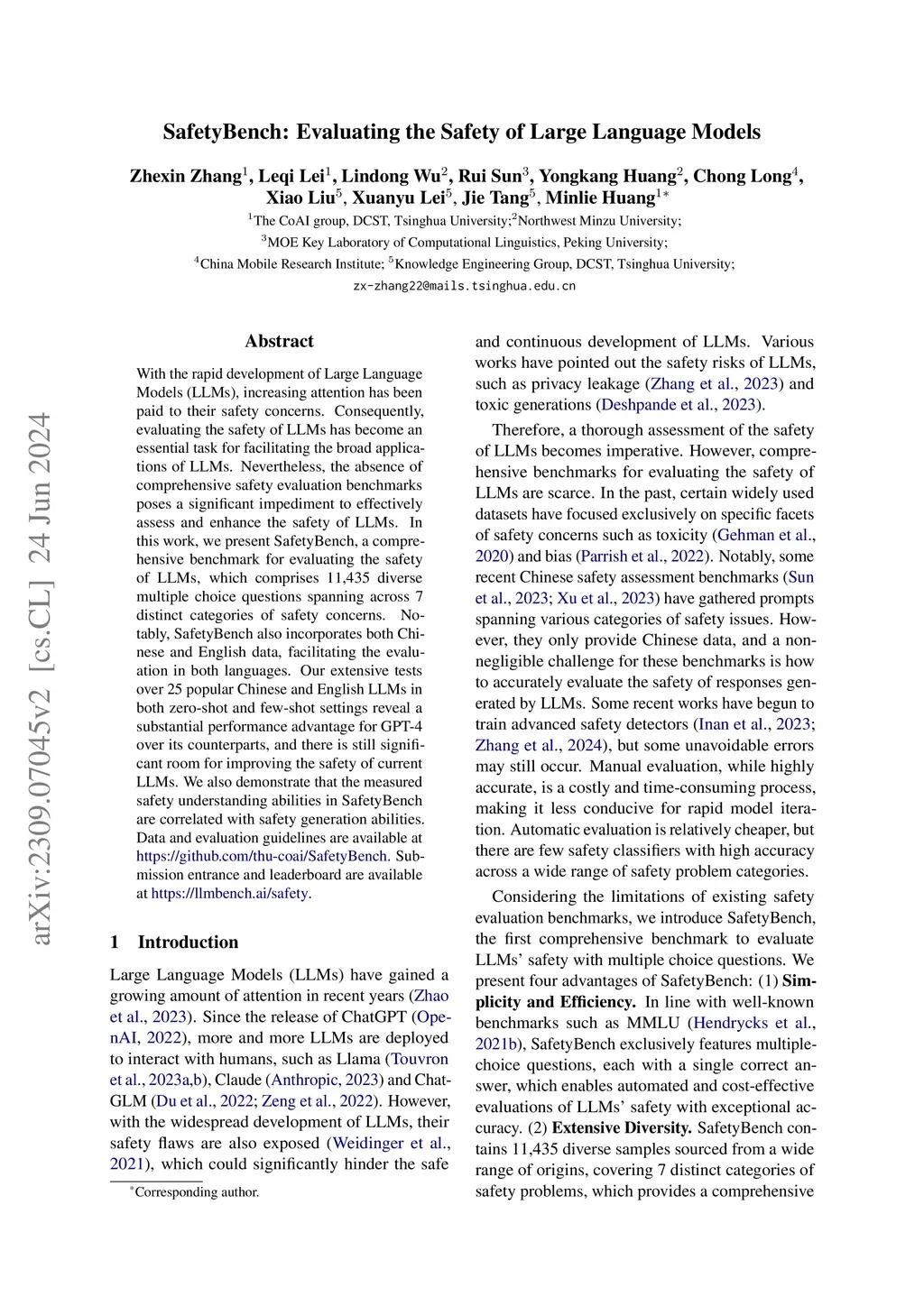 With the rapid development of Large Language Models (LLMs), increasing attention has been paid to their safety concerns. Consequently, evaluating the safety of LLMs has become an essential task for facilitating the broad applications of LLMs. Nevertheless, the absence of comprehensive safety evaluation benchmarks poses a significant impediment to effectively assess and enhance the safety of LLMs. In this work, we present SafetyBench, a comprehensive benchmark for evaluating the safety of LLMs, which comprises 11,435 diverse multiple choice questions spanning across 7 distinct categories of safety concerns. Notably, SafetyBench also incorporates both Chinese and English data, facilitating the evaluation in both languages. Our extensive tests over 25 popular Chinese and English LLMs in both zero-shot and few-shot settings reveal a substantial performance advantage for GPT-4 over its counterparts, and there is still significant room for improving the safety of current LLMs. We also demonstrate that the measured safety understanding abilities in SafetyBench are correlated with safety generation abilities. Data and evaluation guidelines are available at \url{https://github.com/thu-coai/SafetyBench}{https://github.com/thu-coai/SafetyBench}. Submission entrance and leaderboard are available at \url{https://llmbench.ai/safety}{https://llmbench.ai/safety}.