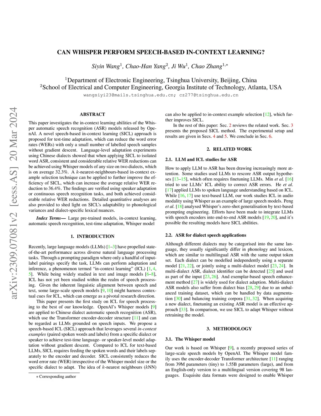 This paper investigates the in-context learning abilities of the Whisper automatic speech recognition (ASR) models released by OpenAI. A novel speech-based in-context learning (SICL) approach is proposed for test-time adaptation, which can reduce the word error rates (WERs) with only a small number of labelled speech samples without gradient descent. Language-level adaptation experiments using Chinese dialects showed that when applying SICL to isolated word ASR, consistent and considerable relative WER reductions can be achieved using Whisper models of any size on two dialects, which is on average 32.3%. A k-nearest-neighbours-based in-context example selection technique can be applied to further improve the efficiency of SICL, which can increase the average relative WER reduction to 36.4%. The findings are verified using speaker adaptation or continuous speech recognition tasks, and both achieved considerable relative WER reductions. Detailed quantitative analyses are also provided to shed light on SICL's adaptability to phonological variances and dialect-specific lexical nuances.