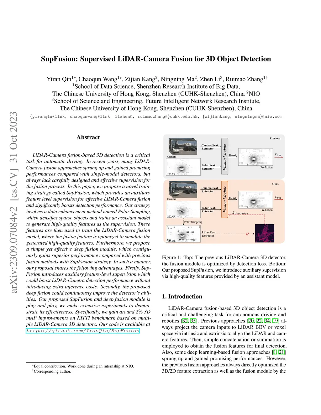 In this paper, we propose a novel training strategy called SupFusion, which provides an auxiliary feature level supervision for effective LiDAR-Camera fusion and significantly boosts detection performance. Our strategy involves a data enhancement method named Polar Sampling, which densifies sparse objects and trains an assistant model to generate high-quality features as the supervision. These features are then used to train the LiDAR-Camera fusion model, where the fusion feature is optimized to simulate the generated high-quality features. Furthermore, we propose a simple yet effective deep fusion module, which contiguously gains superior performance compared with previous fusion methods with SupFusion strategy. In such a manner, our proposal shares the following advantages. Firstly, SupFusion introduces auxiliary feature-level supervision which could boost LiDAR-Camera detection performance without introducing extra inference costs. Secondly, the proposed deep fusion could continuously improve the detector's abilities. Our proposed SupFusion and deep fusion module is plug-and-play, we make extensive experiments to demonstrate its effectiveness. Specifically, we gain around 2% 3D mAP improvements on KITTI benchmark based on multiple LiDAR-Camera 3D detectors.