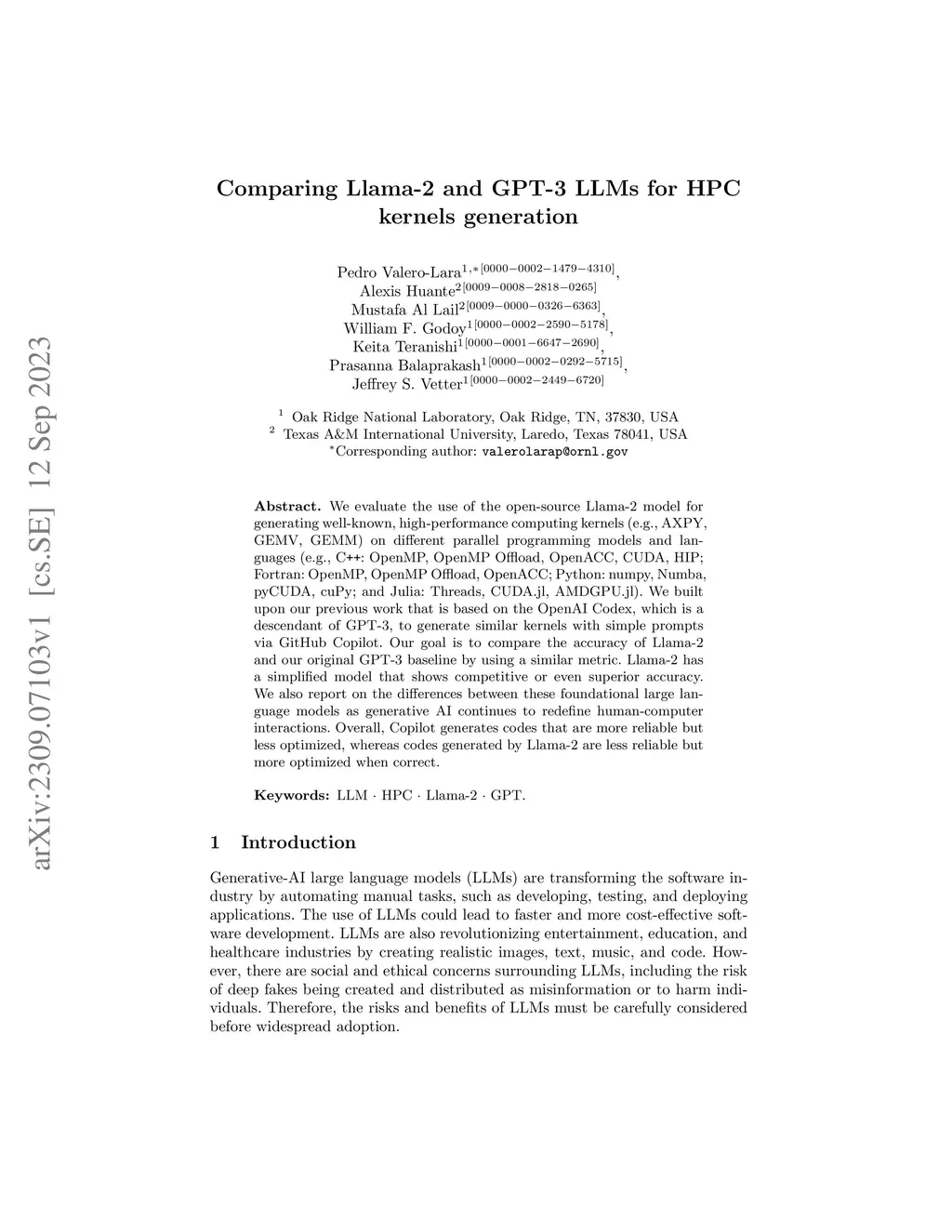 We evaluate the use of the open-source Llama-2 model for generating well-known, high-performance computing kernels (e.g., AXPY, GEMV, GEMM) on different parallel programming models and languages (e.g., C++: OpenMP, OpenMP Offload, OpenACC, CUDA, HIP; Fortran: OpenMP, OpenMP Offload, OpenACC; Python: numpy, Numba, pyCUDA, cuPy; and Julia: Threads, CUDA.jl, AMDGPU.jl). We built upon our previous work that is based on the OpenAI Codex, which is a descendant of GPT-3, to generate similar kernels with simple prompts via GitHub Copilot. Our goal is to compare the accuracy of Llama-2 and our original GPT-3 baseline by using a similar metric. Llama-2 has a simplified model that shows competitive or even superior accuracy. We also report on the differences between these foundational large language models as generative AI continues to redefine human-computer interactions. Overall, Copilot generates codes that are more reliable but less optimized, whereas codes generated by Llama-2 are less reliable but more optimized when correct.