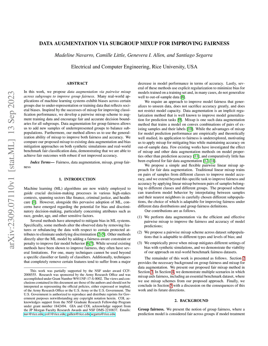 In this work, we propose data augmentation via pairwise mixup across subgroups to improve group fairness. Many real-world applications of machine learning systems exhibit biases across certain groups due to under-representation or training data that reflects societal biases. Inspired by the successes of mixup for improving classification performance, we develop a pairwise mixup scheme to augment training data and encourage fair and accurate decision boundaries for all subgroups. Data augmentation for group fairness allows us to add new samples of underrepresented groups to balance subpopulations. Furthermore, our method allows us to use the generalization ability of mixup to improve both fairness and accuracy. We compare our proposed mixup to existing data augmentation and bias mitigation approaches on both synthetic simulations and real-world benchmark fair classification data, demonstrating that we are able to achieve fair outcomes with robust if not improved accuracy.