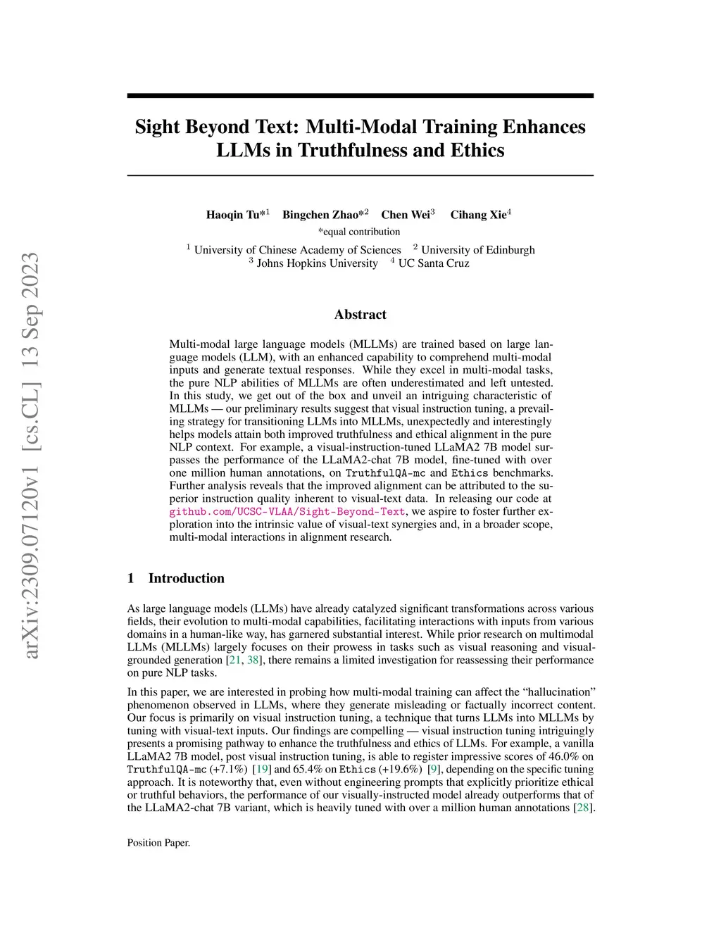 Multi-modal large language models (MLLMs) are trained based on large language models (LLM), with an enhanced capability to comprehend multi-modal inputs and generate textual responses. While they excel in multi-modal tasks, the pure NLP abilities of MLLMs are often underestimated and left untested. In this study, we get out of the box and unveil an intriguing characteristic of MLLMs -- our preliminary results suggest that visual instruction tuning, a prevailing strategy for transitioning LLMs into MLLMs, unexpectedly and interestingly helps models attain both improved truthfulness and ethical alignment in the pure NLP context. For example, a visual-instruction-tuned LLaMA2 7B model surpasses the performance of the LLaMA2-chat 7B model, fine-tuned with over one million human annotations, on TruthfulQA-mc and Ethics benchmarks. Further analysis reveals that the improved alignment can be attributed to the superior instruction quality inherent to visual-text data. In releasing our code at github.com/UCSC-VLAA/Sight-Beyond-Text, we aspire to foster further exploration into the intrinsic value of visual-text synergies and, in a broader scope, multi-modal interactions in alignment research.