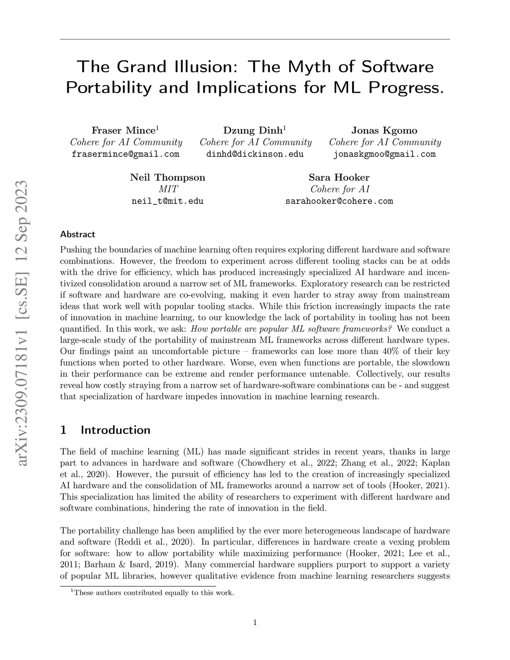 Pushing the boundaries of machine learning often requires exploring different hardware and software combinations. However, the freedom to experiment across different tooling stacks can be at odds with the drive for efficiency, which has produced increasingly specialized AI hardware and incentivized consolidation around a narrow set of ML frameworks. Exploratory research can be restricted if software and hardware are co-evolving, making it even harder to stray away from mainstream ideas that work well with popular tooling stacks. While this friction increasingly impacts the rate of innovation in machine learning, to our knowledge the lack of portability in tooling has not been quantified. In this work, we ask: How portable are popular ML software frameworks? We conduct a large-scale study of the portability of mainstream ML frameworks across different hardware types. Our findings paint an uncomfortable picture -- frameworks can lose more than 40% of their key functions when ported to other hardware. Worse, even when functions are portable, the slowdown in their performance can be extreme and render performance untenable. Collectively, our results reveal how costly straying from a narrow set of hardware-software combinations can be - and suggest that specialization of hardware impedes innovation in machine learning research.