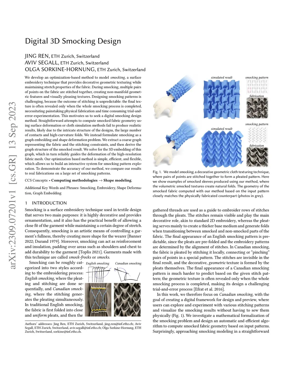 We develop an optimization-based method to model smocking, a surface embroidery technique that provides decorative geometric texturing while maintaining stretch properties of the fabric. During smocking, multiple pairs of points on the fabric are stitched together, creating non-manifold geometric features and visually pleasing textures. Designing smocking patterns is challenging, because the outcome of stitching is unpredictable: the final texture is often revealed only when the whole smocking process is completed, necessitating painstaking physical fabrication and time consuming trial-and-error experimentation. This motivates us to seek a digital smocking design method. Straightforward attempts to compute smocked fabric geometry using surface deformation or cloth simulation methods fail to produce realistic results, likely due to the intricate structure of the designs, the large number of contacts and high-curvature folds. We instead formulate smocking as a graph embedding and shape deformation problem. We extract a coarse graph representing the fabric and the stitching constraints, and then derive the graph structure of the smocked result. We solve for the 3D embedding of this graph, which in turn reliably guides the deformation of the high-resolution fabric mesh. Our optimization based method is simple, efficient, and flexible, which allows us to build an interactive system for smocking pattern exploration. To demonstrate the accuracy of our method, we compare our results to real fabrications on a large set of smocking patterns