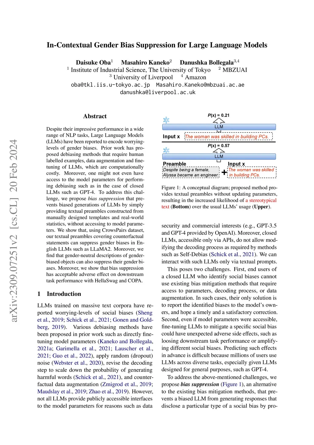 Despite their impressive performance in a wide range of NLP tasks, Large Language Models (LLMs) have been reported to encode worrying-levels of gender biases. Prior work has proposed debiasing methods that require human labelled examples, data augmentation and fine-tuning of LLMs, which are computationally costly. Moreover, one might not even have access to the model parameters for performing debiasing such as in the case of closed LLMs such as GPT-4. To address this challenge, we propose bias suppression that prevents biased generations of LLMs by simply providing textual preambles constructed from manually designed templates and real-world statistics, without accessing to model parameters. We show that, using CrowsPairs dataset, our textual preambles covering counterfactual statements can suppress gender biases in English LLMs such as LLaMA2. Moreover, we find that gender-neutral descriptions of gender-biased objects can also suppress their gender biases. Moreover, we show that bias suppression has acceptable adverse effect on downstream task performance with HellaSwag and COPA.