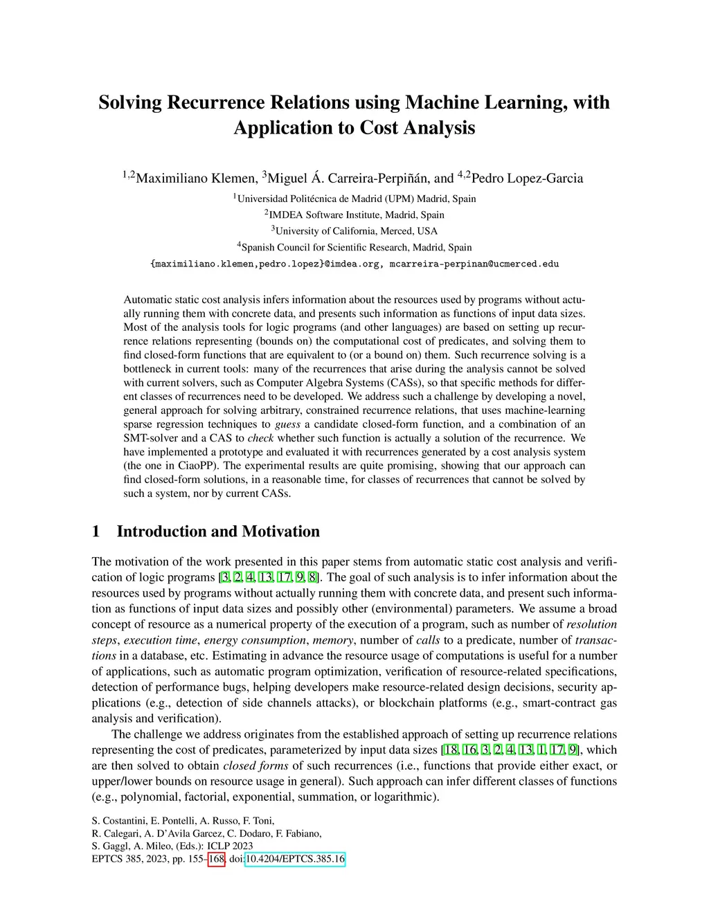 Automatic static cost analysis infers information about the resources used by programs without actually running them with concrete data, and presents such information as functions of input data sizes. Most of the analysis tools for logic programs (and other languages) are based on setting up recurrence relations representing (bounds on) the computational cost of predicates, and solving them to find closed-form functions that are equivalent to (or a bound on) them. Such recurrence solving is a bottleneck in current tools: many of the recurrences that arise during the analysis cannot be solved with current solvers, such as Computer Algebra Systems (CASs), so that specific methods for different classes of recurrences need to be developed. We address such a challenge by developing a novel, general approach for solving arbitrary, constrained recurrence relations, that uses machine-learning sparse regression techniques to guess a candidate closed-form function, and a combination of an SMT-solver and a CAS to check whether such function is actually a solution of the recurrence. We have implemented a prototype and evaluated it with recurrences generated by a cost analysis system (the one in CiaoPP). The experimental results are quite promising, showing that our approach can find closed-form solutions, in a reasonable time, for classes of recurrences that cannot be solved by such a system, nor by current CASs.