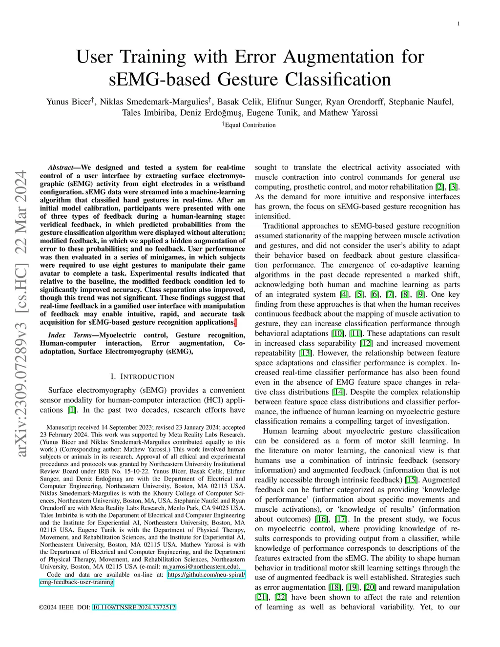 We designed and tested a system for real-time control of a user interface by extracting surface electromyographic (sEMG) activity from eight electrodes in a wrist-band configuration. sEMG data were streamed into a machine-learning algorithm that classified hand gestures in real-time. After an initial model calibration, participants were presented with one of three types of feedback during a human-learning stage: veridical feedback, in which predicted probabilities from the gesture classification algorithm were displayed without alteration, modified feedback, in which we applied a hidden augmentation of error to these probabilities, and no feedback. User performance was then evaluated in a series of minigames, in which subjects were required to use eight gestures to manipulate their game avatar to complete a task. Experimental results indicated that, relative to baseline, the modified feedback condition led to significantly improved accuracy and improved gesture class separation. These findings suggest that real-time feedback in a gamified user interface with manipulation of feedback may enable intuitive, rapid, and accurate task acquisition for sEMG-based gesture recognition applications.